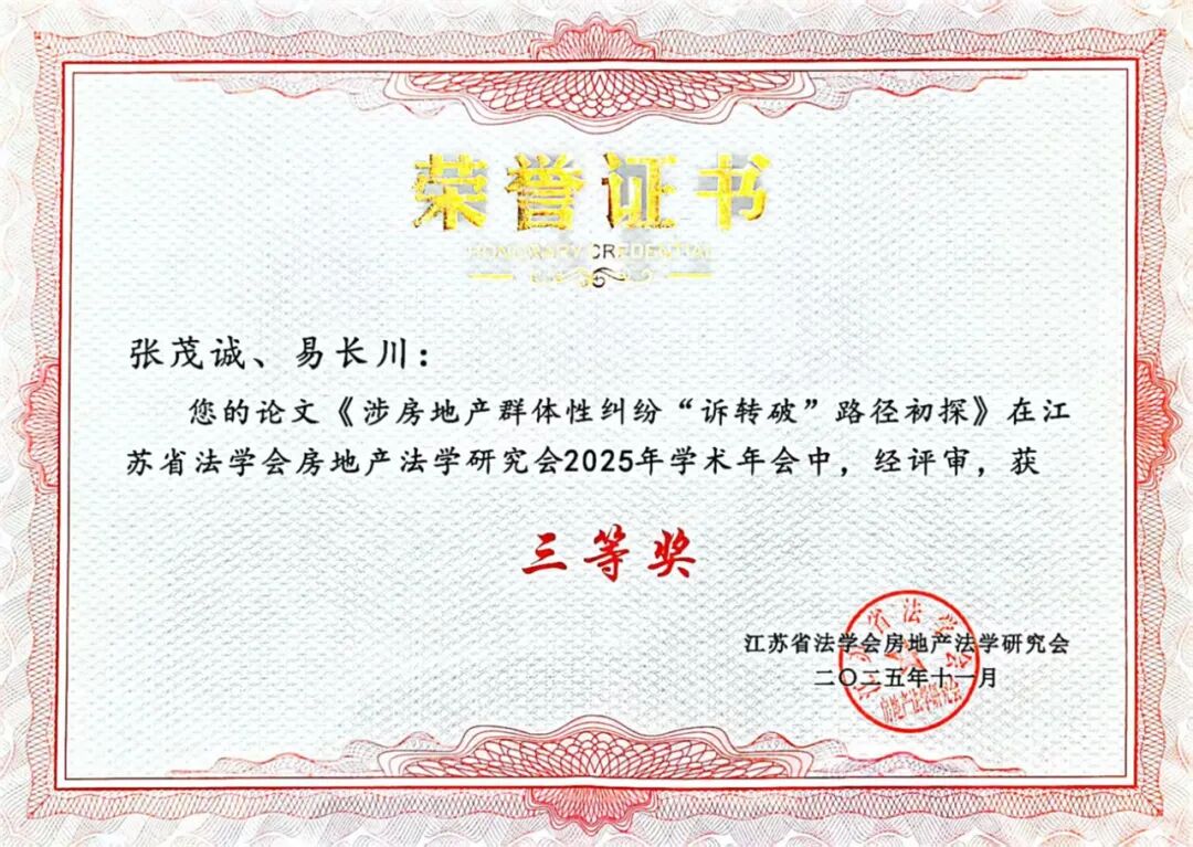 江苏江成律所斩获省房地产法学研究会年会大奖