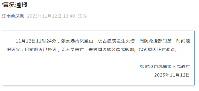 11月12日11时24分,张家港市凤凰山一仿古建筑发生火情,消防救援部门第一时间组织灭火,目前明火已扑灭,无人员伤亡,未对周边林区造成影响。起火原因正在调查。