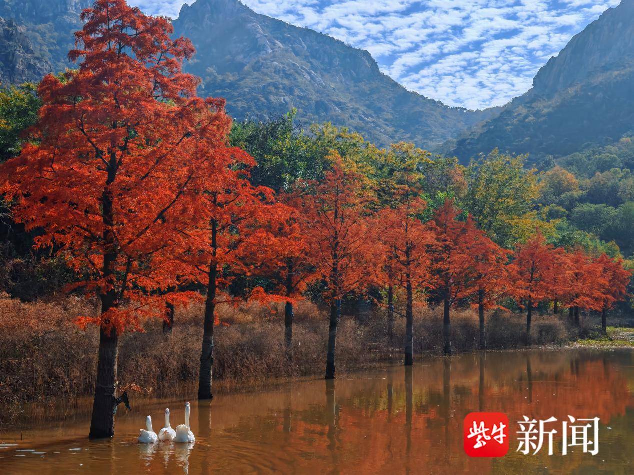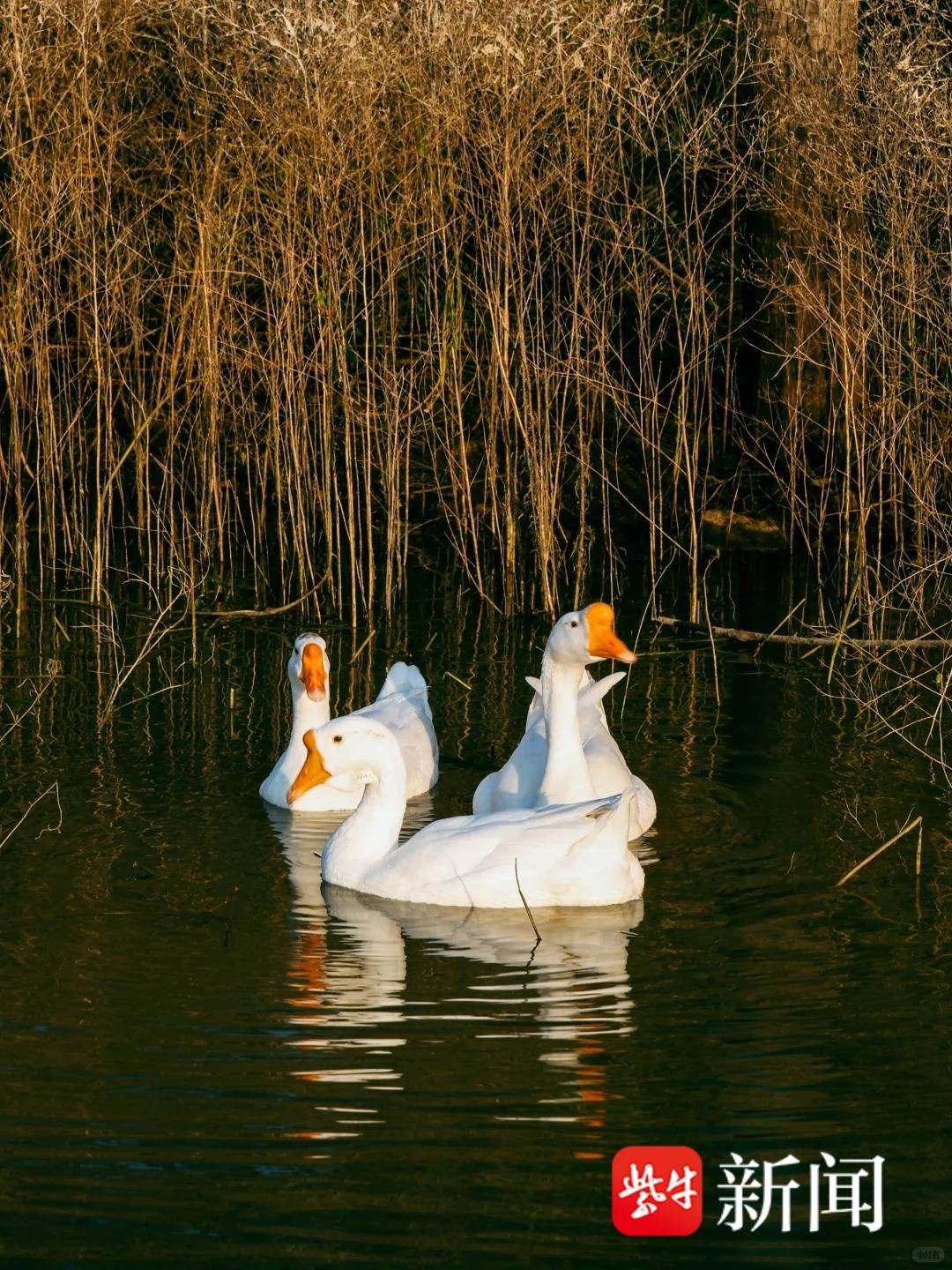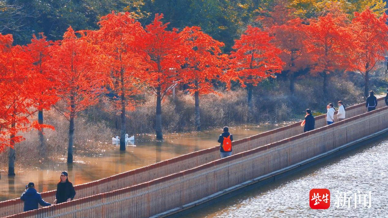 “太美了,午饭后来散散步!”11月11日,家住连云港市海州区园林村的张阿姨,漫步在锦屏山游步道园林水库栈桥,忍不住连连赞叹。初冬时节,这片城市与自然交界的秘境正上演色彩盛宴——古老水杉换上红褐色“盛装”,挺拔枝干倒映如镜湖面,成群白鹅悠然戏水,动静之间勾勒出一幅静谧又灵动的生态画卷。
