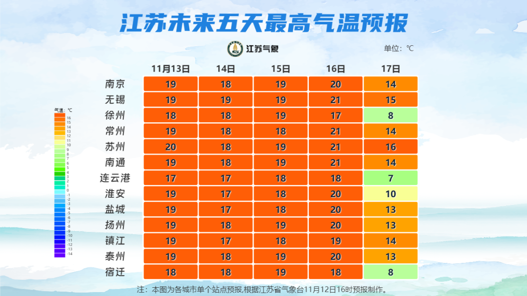 最高温度:淮北地区18℃左右,其他地区19~20℃;