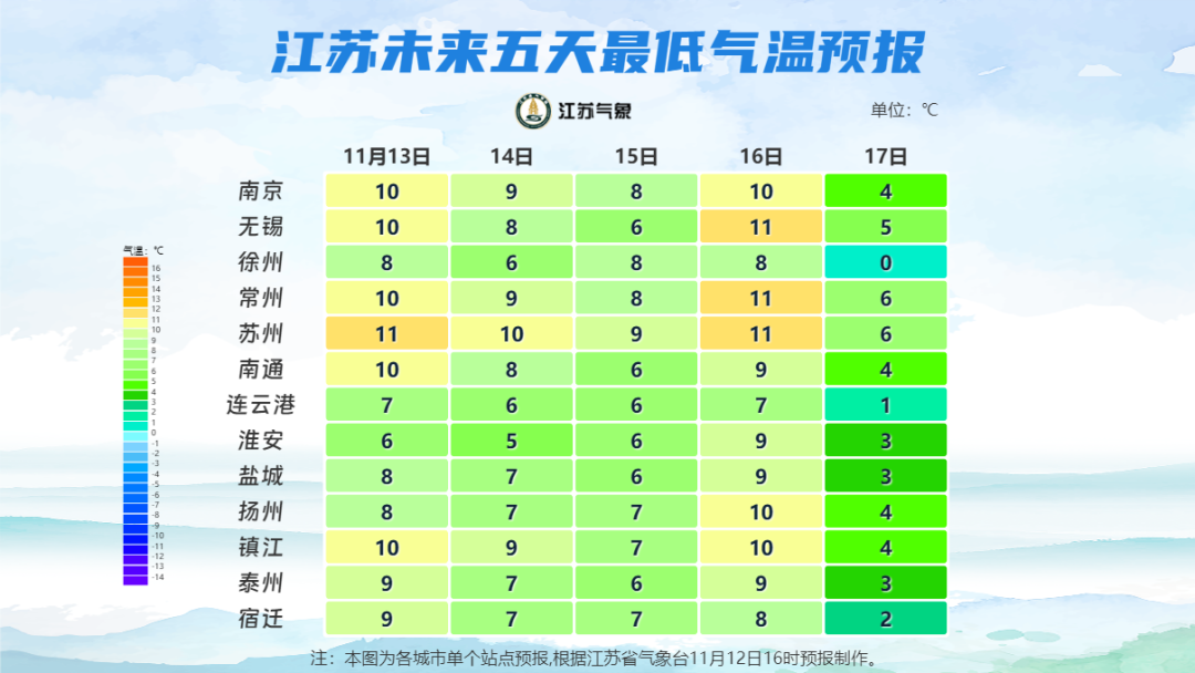 最低温度:沿淮和淮北地区5~6℃,其他地区7~8℃。