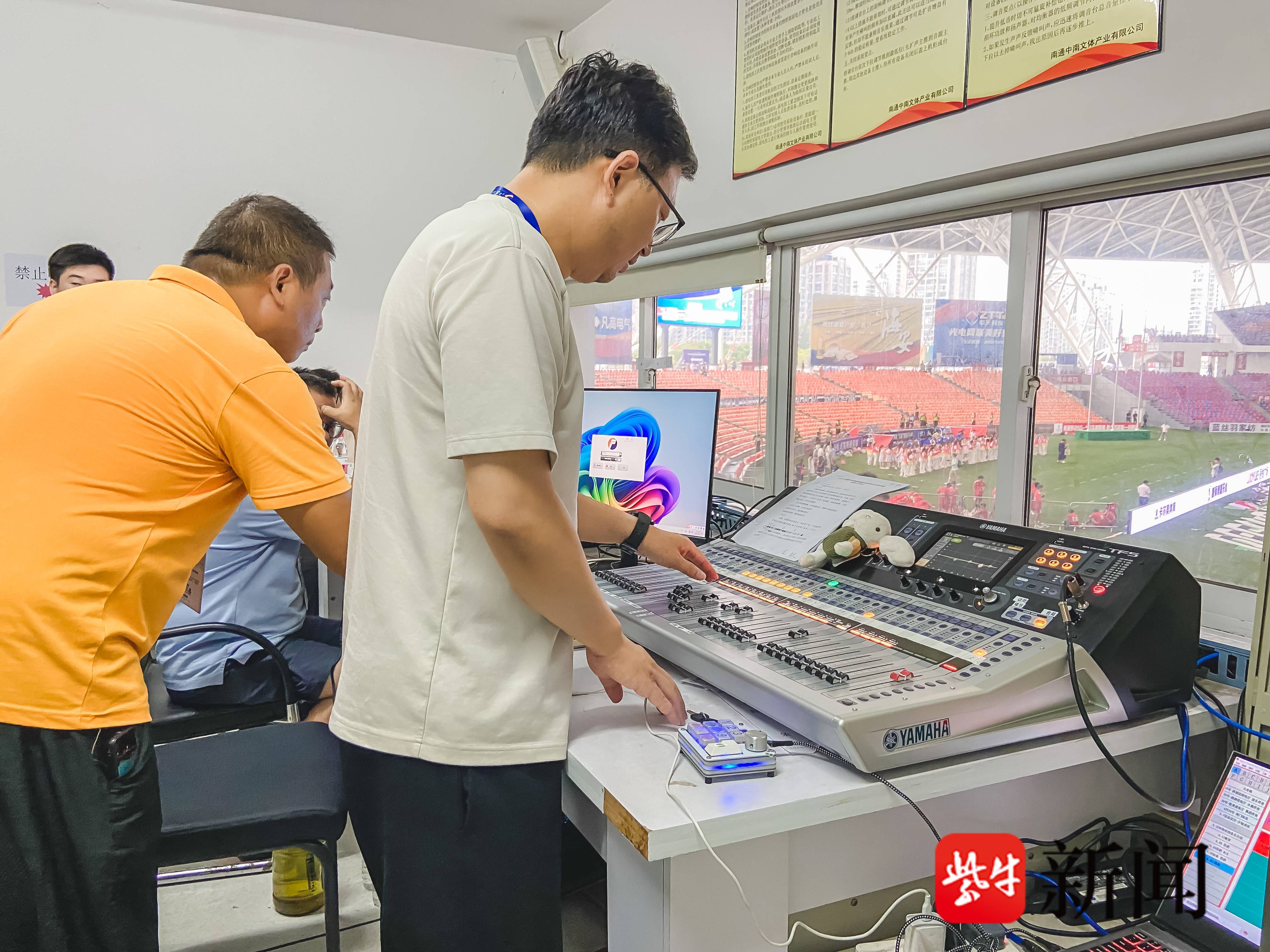 赛事当天的有序推进,离不开技术保障与安全守护的双线并行,党员干部带头坚守,为赛事筑起坚固防线。党员沈颖作为播控组组长,秉持“播控无小事”理念,攻克首场南通大学赛事设备调试难题,转战海门基地时克服人员紧缺、设备不熟的困难提前排查安全隐患;酷暑时节在如皋基地,制定“秒级”控制流程;新主场启用前反复调试解决闭顶结构声学难题。累计超200小时音视频播控,CCTV5直播倒计时与信号切换分秒不差,他用专业与担当诠释党员的初心使命。安保检票组负责人吴为深知“检票口是安全第一道屏障”,在四次更换主场中的挑战中,带领团队推演动线、优化安检方案,针对1号门高检票量调整部署、组织全流程“彩排”,妥善处理突发情况,完成近千人次志愿者培训,保障超21万人次观众安全入场。王凯作为媒体服务的“护航者”,协调转播团队完成多机位部署与信号保障,每场组织50-60家媒体,布置功能明确的新闻中心,赛中穿梭协调,让赛事精彩通过镜头与文字传遍各地。