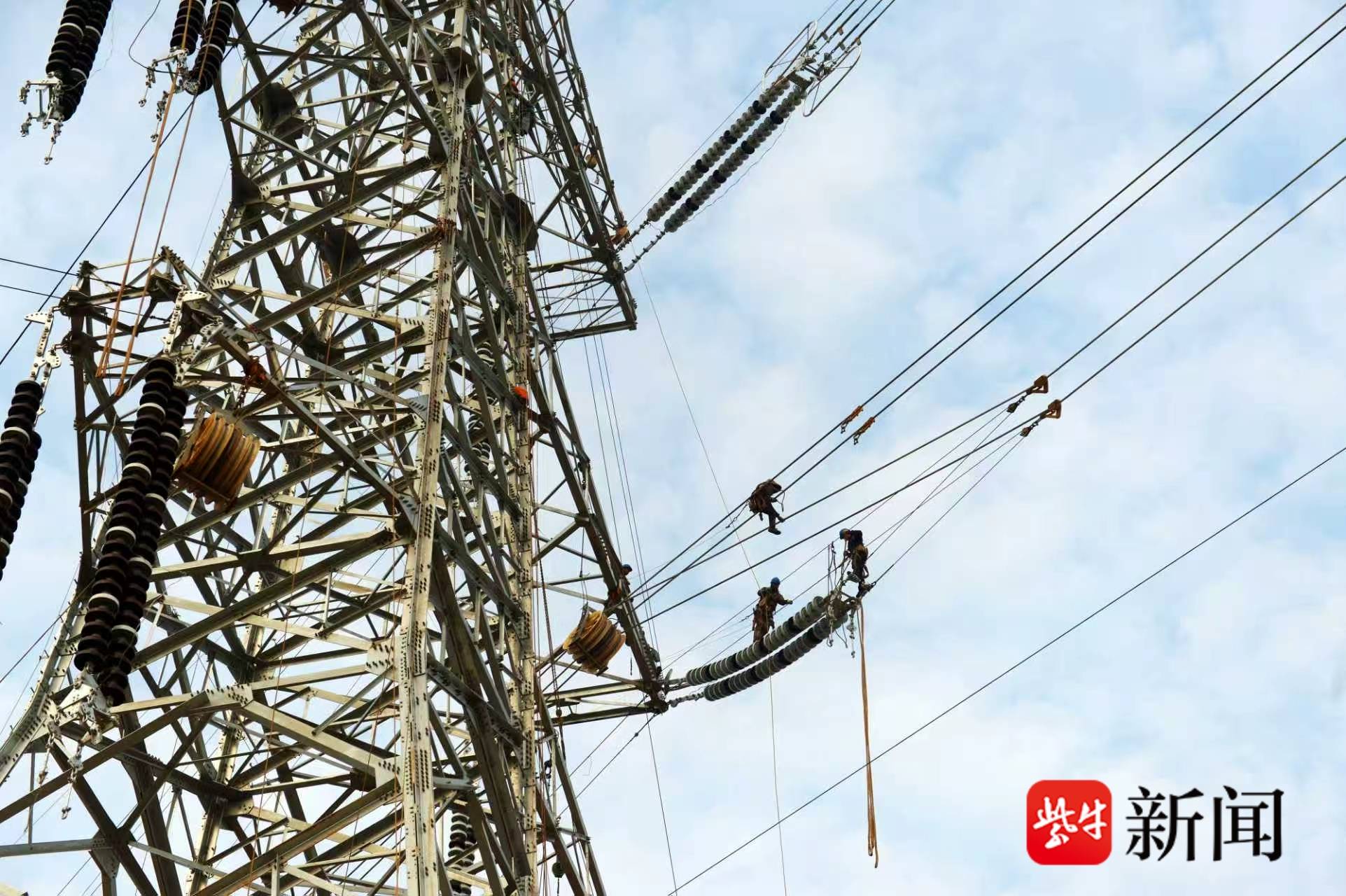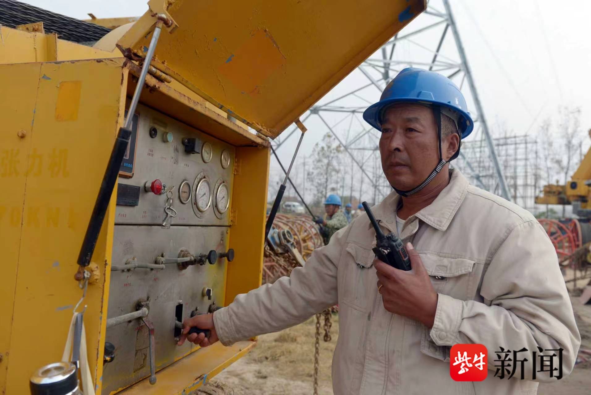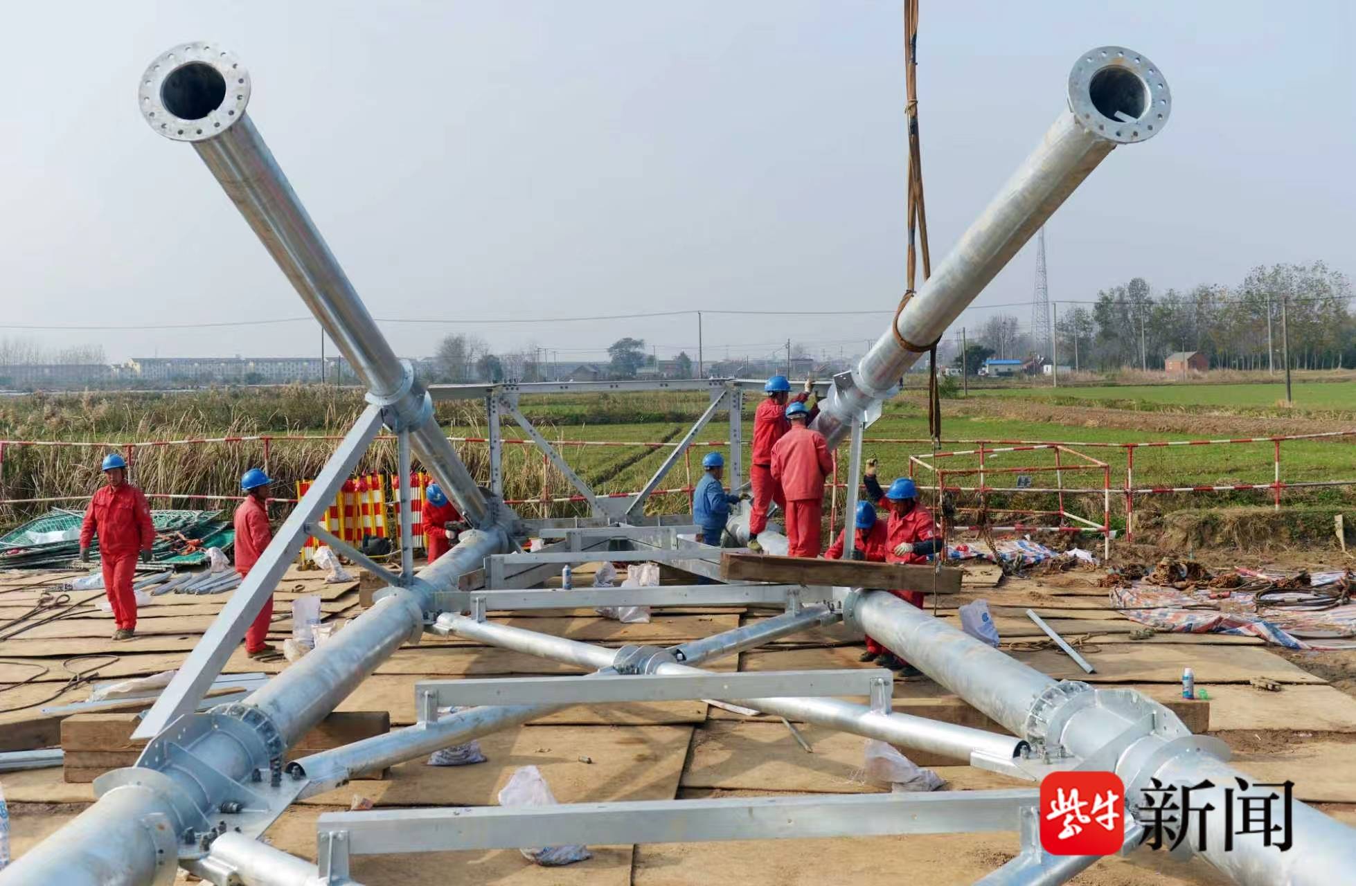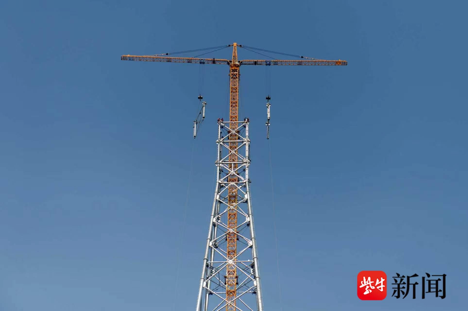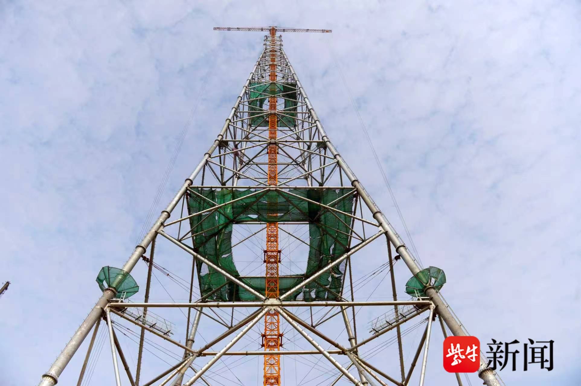 11月13日,跨越江苏淮河的500千伏输电工程南侧跨越塔封顶。