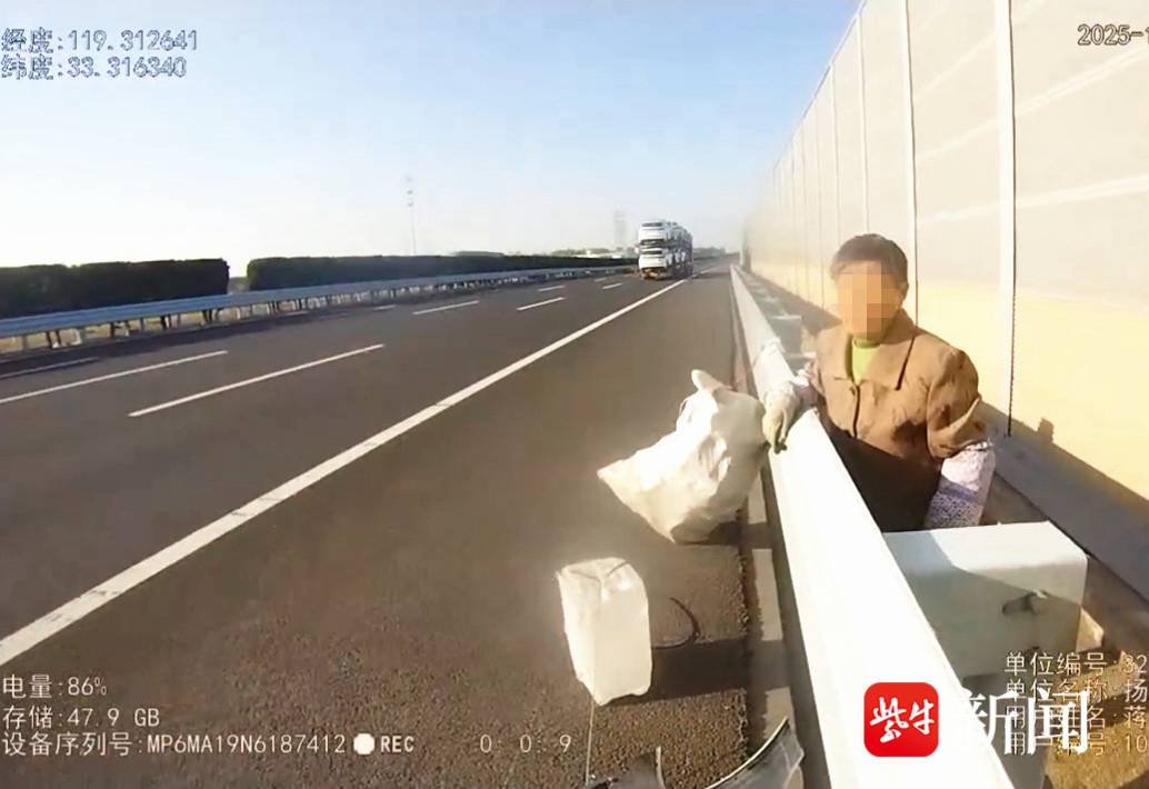 记者了解到,事发10 日下午14时许,扬州市公安局交管支队高速公路二大队指挥室视频巡查发现,京沪高速公路下行线(北京往上海方向)864公里处,一名行人在应急车道内活动,过往车辆不断,情况危急。指挥室随即通知路面巡逻民出警,前往处置。