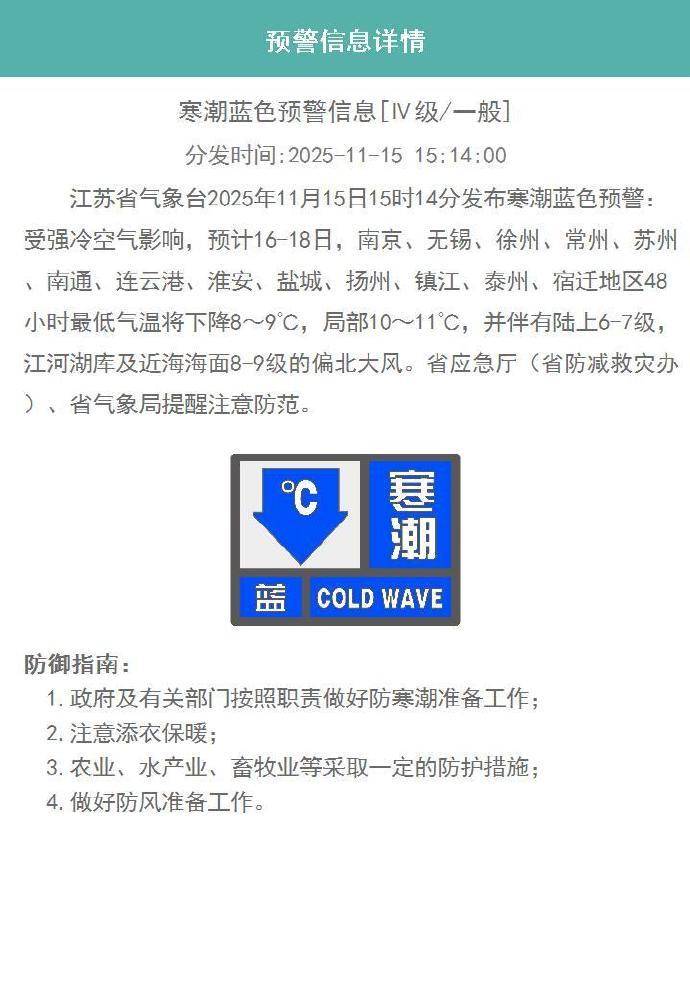 11月15日15时14分,江苏省气象台发布寒潮蓝色预警:受强冷空气影响,预计16-18日,南京、无锡、徐州、常州、苏州、南通、连云港、淮安、盐城、扬州、镇江、泰州、宿迁地区48小时最低气温将下降8~9℃,局部10~11℃,并伴有陆上6-7级,江河湖库及近海海面8-9级的偏北大风。省应急厅、省气象局提醒注意防范。