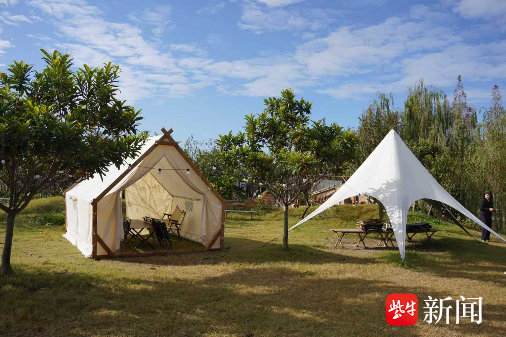露营帐篷、白色吊桥、咖啡小屋点缀于片片果林间,在市民“微度假”的镜头里相当“出片”。这里是金沙街道金北村的通州区金沙枇杷哥家庭农场,也是最近“出圈”的网红场所。这个家庭农场占地50亩,主要从事四季应时水果的种植、采摘。去年以来,农场主邵琳响应“农旅融合”大趋势,推出集亲子娱乐、小型团建、露营烧烤于一体的休闲业态,结合水果采摘,让游客在自然氛围中尽享田园风味。