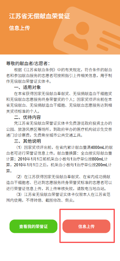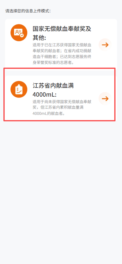 2.江苏省内献血满4000mL:若您尚未获得国家无偿献血奉献奖,但在江苏省内已累计捐献血液满4000mL,请选择此选项上传信息。