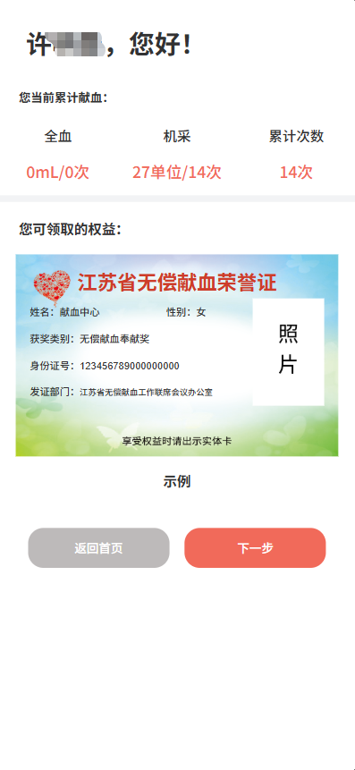 1.点击【江苏省内献血满4000mL】,点击下一步。
