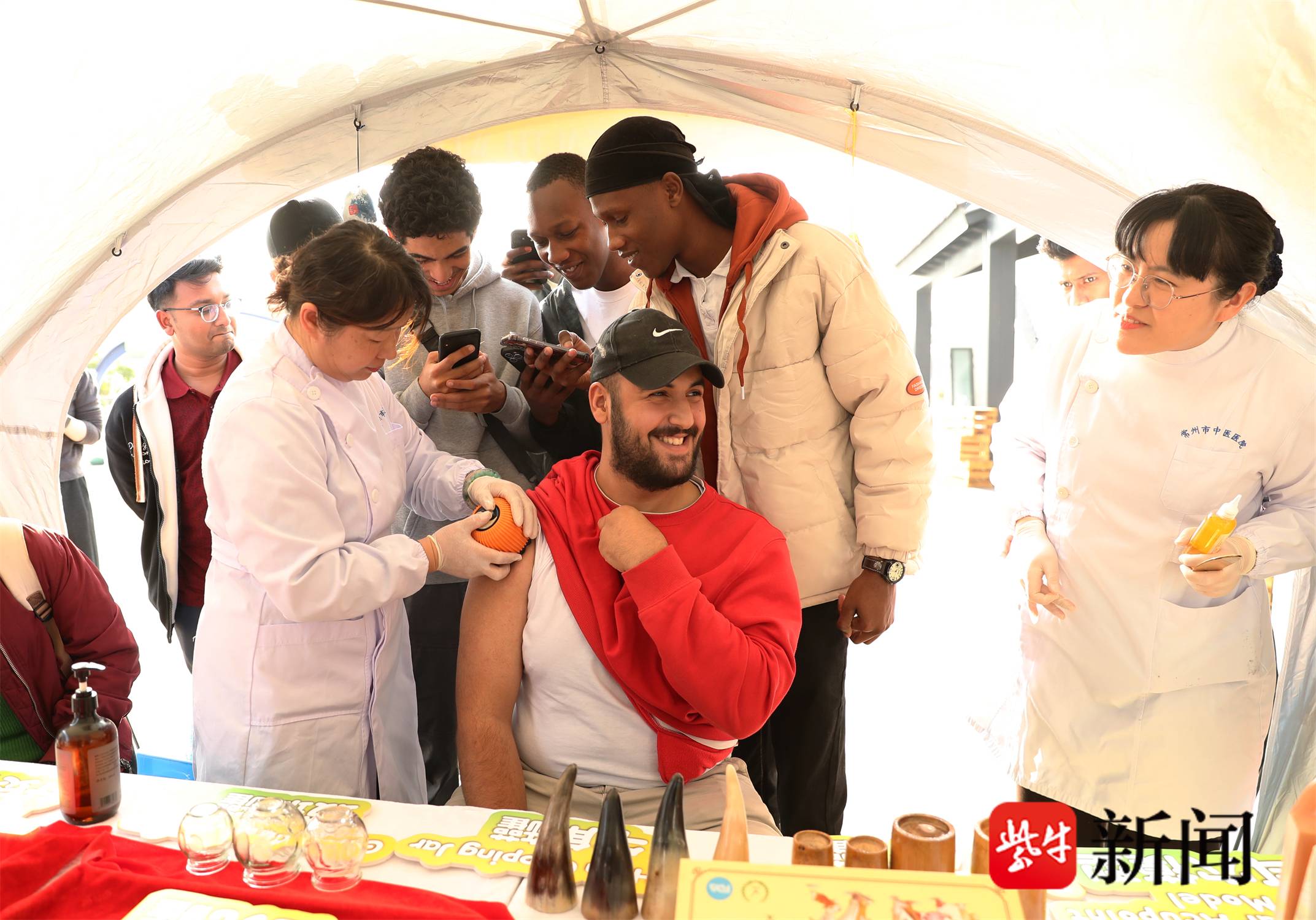 在中医适宜技术体验区,留学生们对针灸、推拿、刮痧、火龙罐、耳穴埋籽等技法表现出浓厚兴趣。也门留学生马欣因肩膀疼痛,亲身体验了非遗“兰陵程氏针灸”与火龙罐技术后惊叹:“第一次体验,非常神奇!我相信中医能治好我的肩膀。”