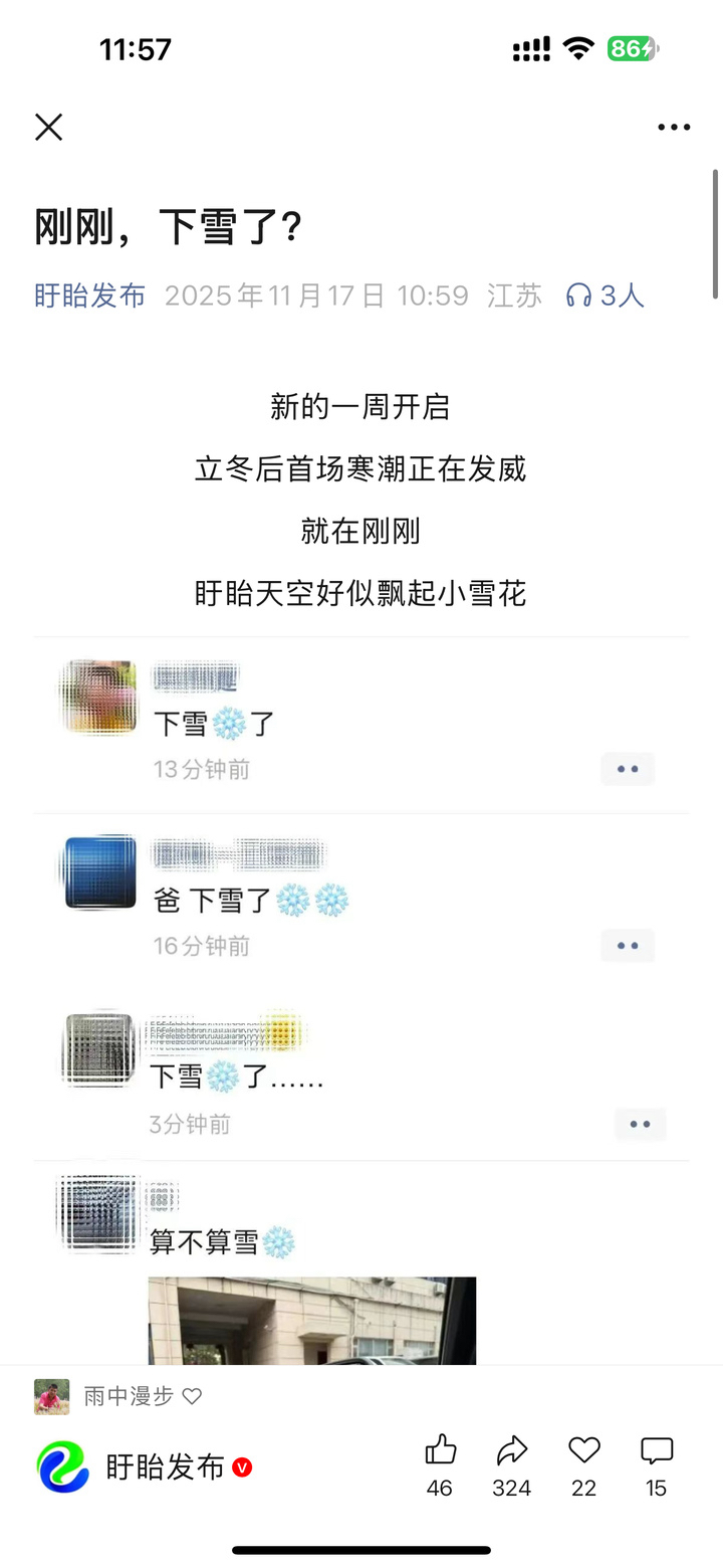 扬子晚报网11月17日讯(记者 万惠娟)17日上午,有江苏淮安网友发布视频称:盱眙迎来2025年立冬之后首场雪!