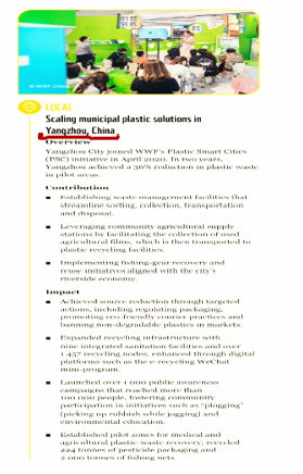 与此同时,世界自然基金会(WWF)高度认可了扬州取得的系列成效:“通过针对性行动实现源头减量,包括规范包装、推广环保快递模式,以及在农贸市场禁用不可降解塑料;扩建回收基础设施,新增9处再生资源绿色分拣中心和超过1457个回收点,并通过微信小程序等数字平台提升效率;开展超过1000场公众宣传活动,覆盖超10万人,推动社区参与plogging(捡拾慢跑)等活动和环境教育;设立医疗与农业塑料垃圾回收试点区域,回收了224吨农药包装和2000吨渔网”。