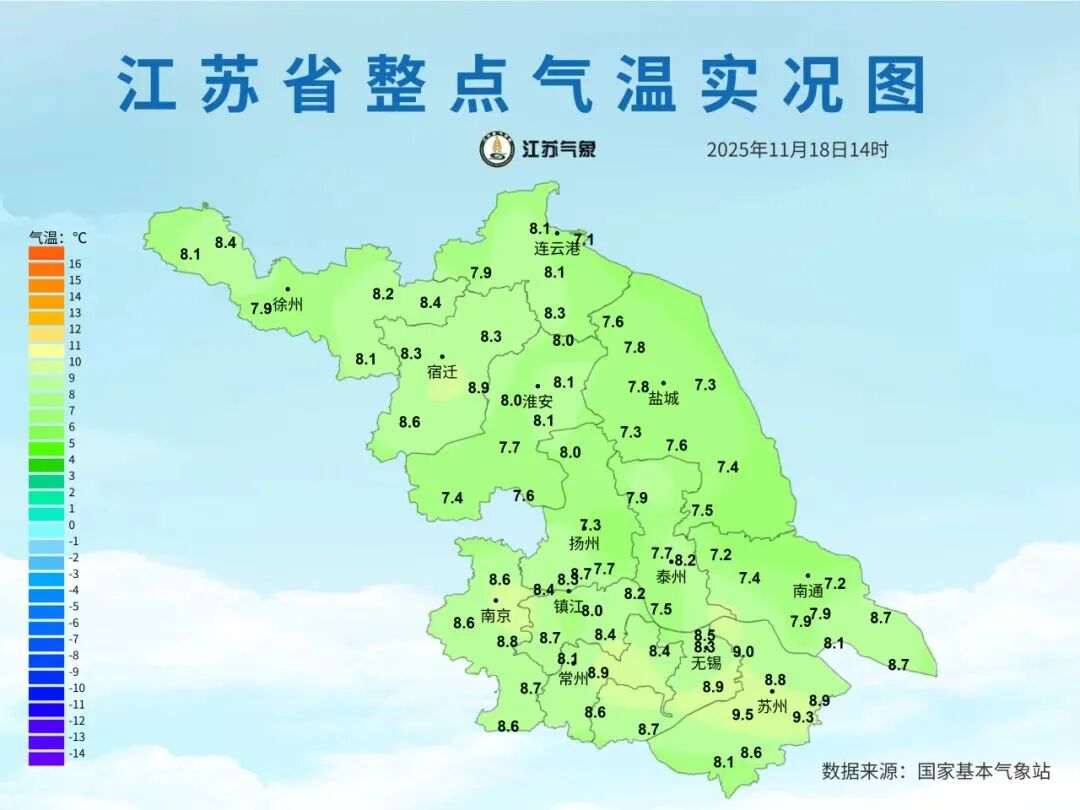 全省晴到少云。最高温度:沿江和苏南地区16℃左右,其他地区14~15℃;最低温度:淮北地区0~1℃,其他地区3℃左右。全省偏西风3-4级。