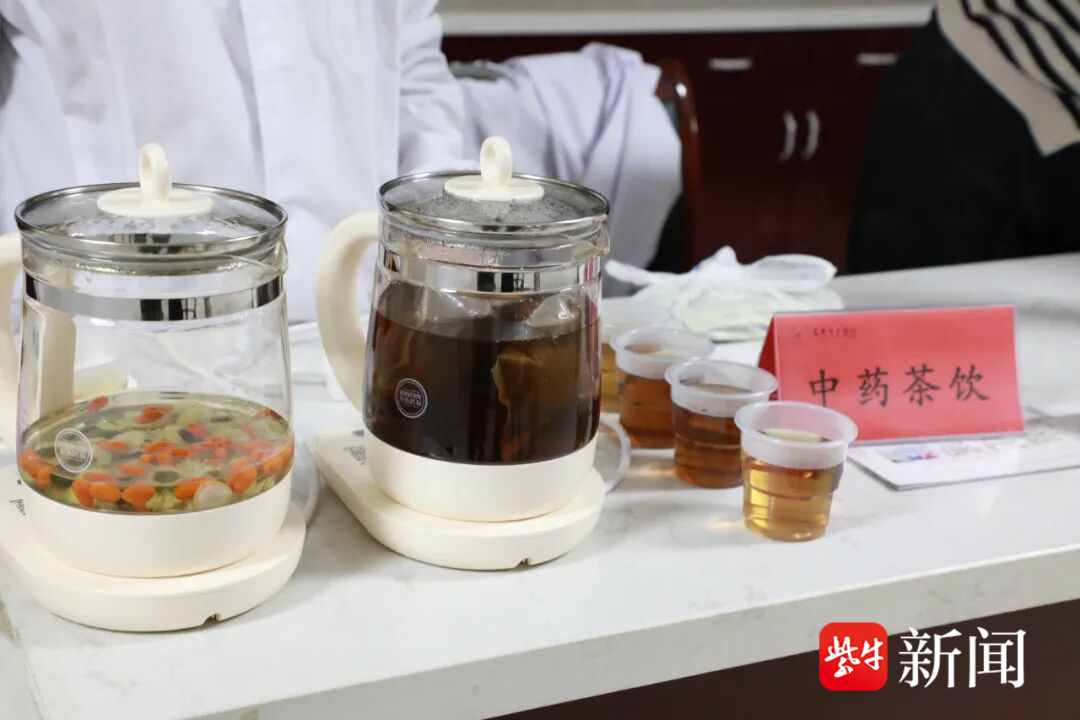 患者等候区,泰兴中医院精心准备了清咽利喉的秋梨膏以及化湿轻体饮等多款养生茶饮,大家端着茶杯细细品味,感受中医药的温润滋养,同时向专业药师咨询适合自己的茶饮方,在轻松氛围中学习实用养生知识。