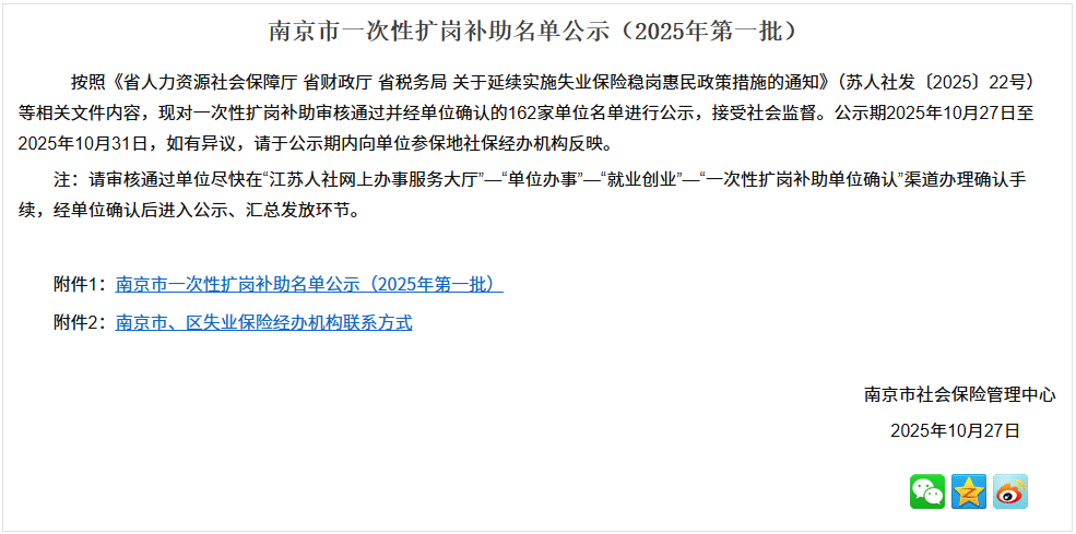 目前,江苏多地已经开始一次性扩岗补助的派发,如南京2025年第一批享受一次性扩岗补助的162家企业正在公示中,公示结束后,资金将直接打入公司对公账户或税务部门提供的社保缴费账户。