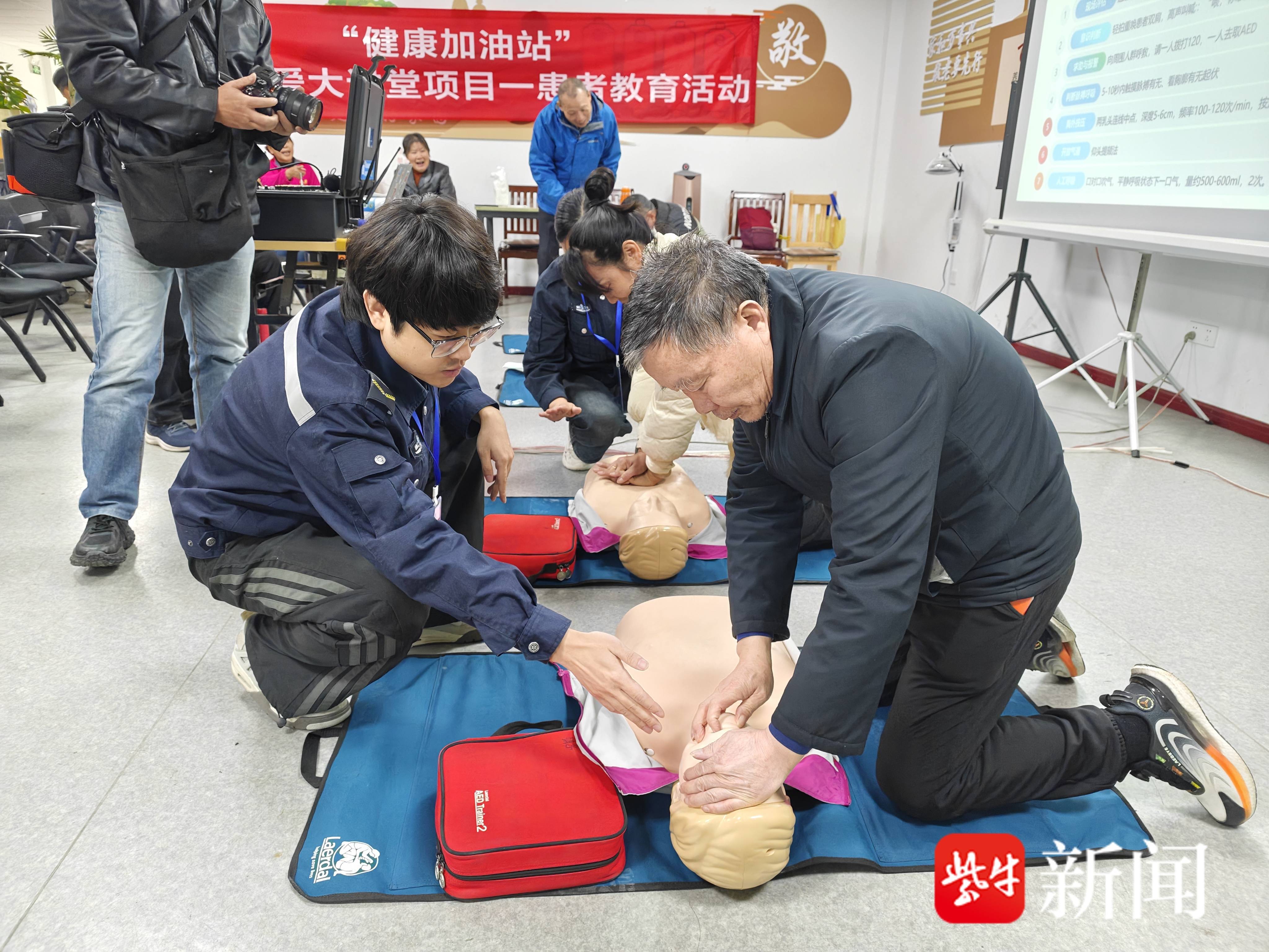 现场,由江苏大学附属医院急诊科副主任张浩与市急救中心培训导师授课,通过专业讲座与实操演练相结合的方式,向社区居民普及急性心梗的识别、自救及急救技能。