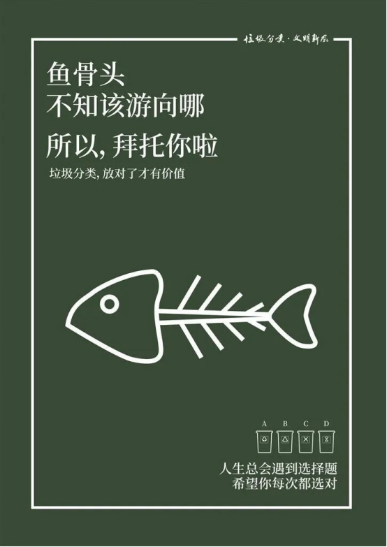 在二等奖获得者张文娟、张定龙的作品中,具有辨识度的垃圾桶标识强化了视觉记忆点,帮助受众快速识别不同垃圾品类。“作品底部的徐州地标建筑线稿,增强了地域归属感,让本地受众更有共鸣,也传递出‘垃圾分类是城市共建行动’的理念,使公益主题更具落地感。”评审专家介绍说,该作品的文案表达对仗工整,采用四字短语组合形式,既简洁明了,又富有韵律,便于传播和记忆。