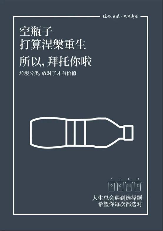 关于获奖作品,评审专家给出了相应理由。一等奖获得者厉洪亮的作品线条简洁,视觉符号清晰,识别性强;同时采用拟人化叙事手法,让冰冷的垃圾拥有情感与期待,极易引发受众的共情心理,打破了垃圾分类宣传的生硬感。评审专家认为:“该系列作品紧扣‘垃圾分类,放对了才有价值’主题,通过不同垃圾的诉求,强化了分类对激活垃圾价值的意义;同时,以‘人生选择题’进行类比,将垃圾分类行为上升到生活态度层面,立意具有深度。”