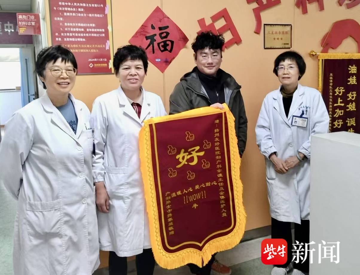 20日下午,家住东方百合园小区的陈先生第二次来到扬州市友好医院,说他和爱人孙女士还要特别送妇产科病房的医生护士锦旗,锦旗上的内容“确认过眼神,是帮我卸货的神”,故事感和专属感满满,令人眼前一亮。除了精致的锦旗,感恩的小夫妻还特意买了奶茶、芝士面包、鹌鹑蛋、护手霜和橙子,还有一大束特别的“笔花”,就是用很多笔组成的实用的“花”,感谢妇产科全体医护人员的辛勤付出。面对一推再推的医护,小夫妻俩诚恳地说,大家平时工作太辛苦了,这些都是日常用得到的,不值钱,表达一下他们的心意,请务必收下。
