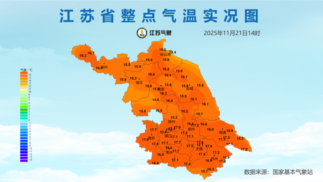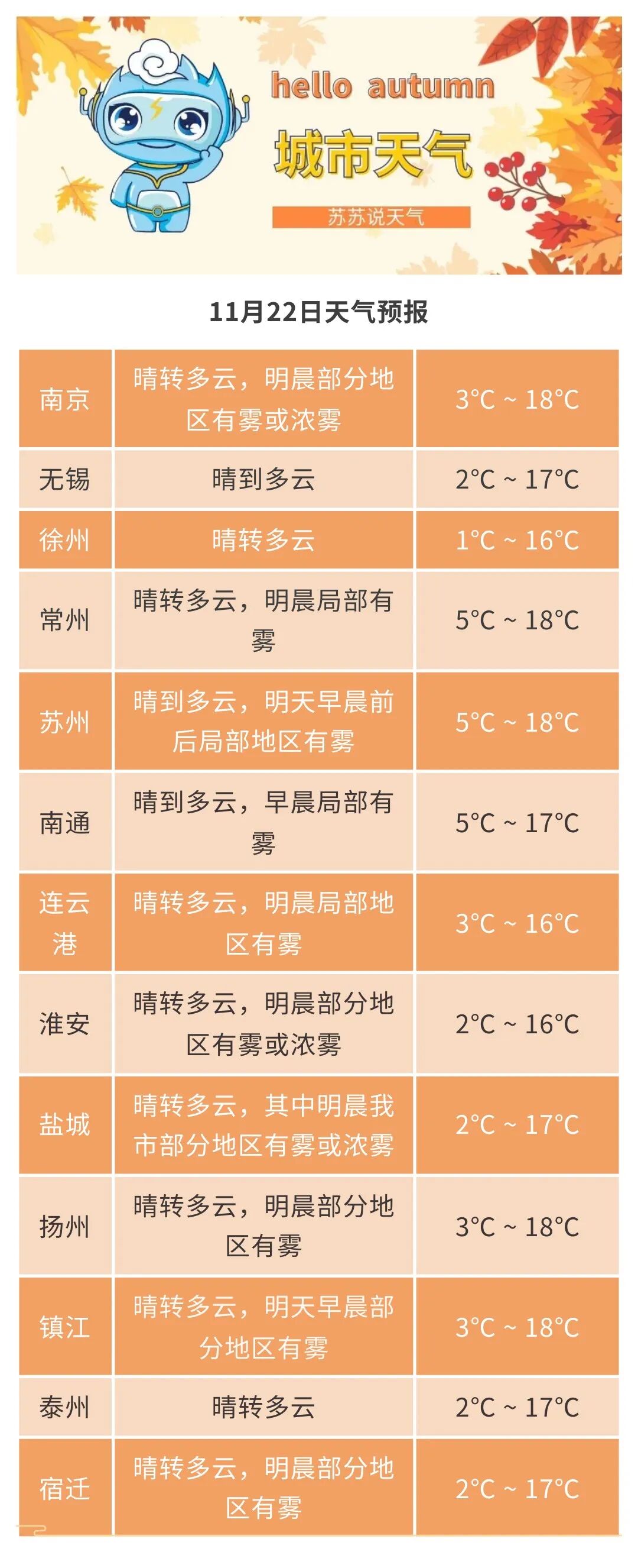 全省晴转多云。最高温度:淮北地区15℃左右,其他地区16~17℃;最低温度:沿江和苏南地区3~4℃,其他地区1~2℃。全省偏南风3-4级。