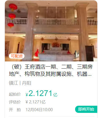 丹阳老牌四星级酒店王府酒店破产拍卖,起拍价 2.127 亿元