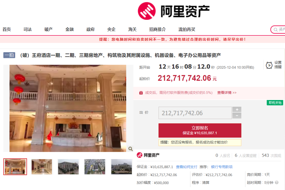 扬子晚报网11月22日讯(记者 万凌云 姜天圣)近日,丹阳市首家按四星级标准建设的大型国际酒店 —— 王府酒店,因股东花王国际建设集团有限公司破产清算,其相关资产在阿里拍卖平台正式挂牌拍卖,起拍总价达 2.127 亿元,引发社会各界关注。