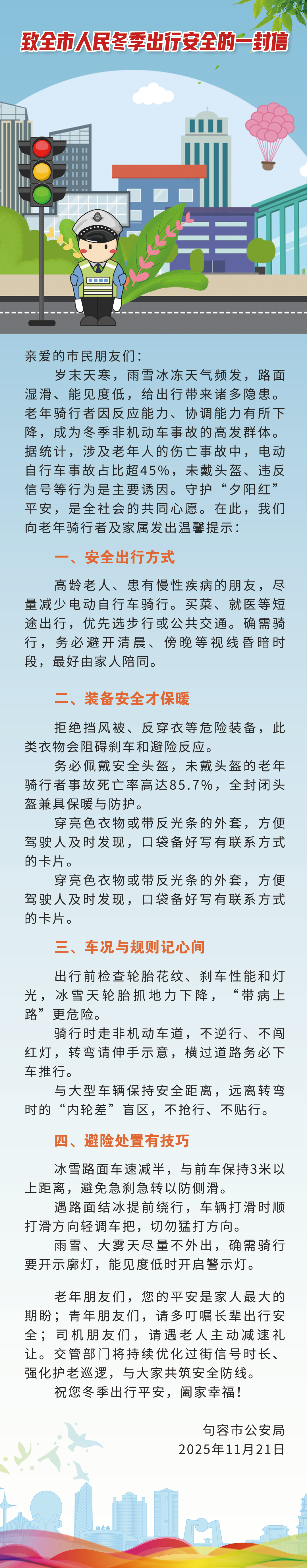 扬子晚报网11月22日讯(通讯员 张雪 记者 万凌云 姜天圣)11月21日,句容市公安局发布《致全市人民冬季出行安全的一封信》,从出行方式、安全装备、车况规则、避险技巧等方面发出温馨提示,呼吁老年骑行者提高防护意识,家属多叮嘱、司机主动礼让,全社会共同筑牢冬季出行安全防线。