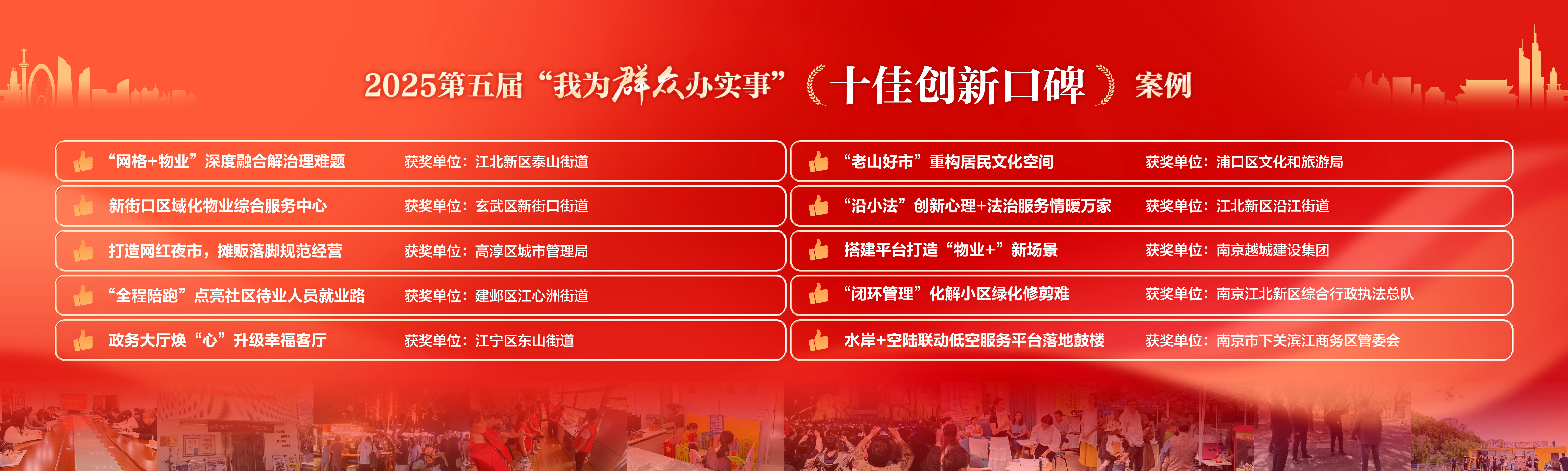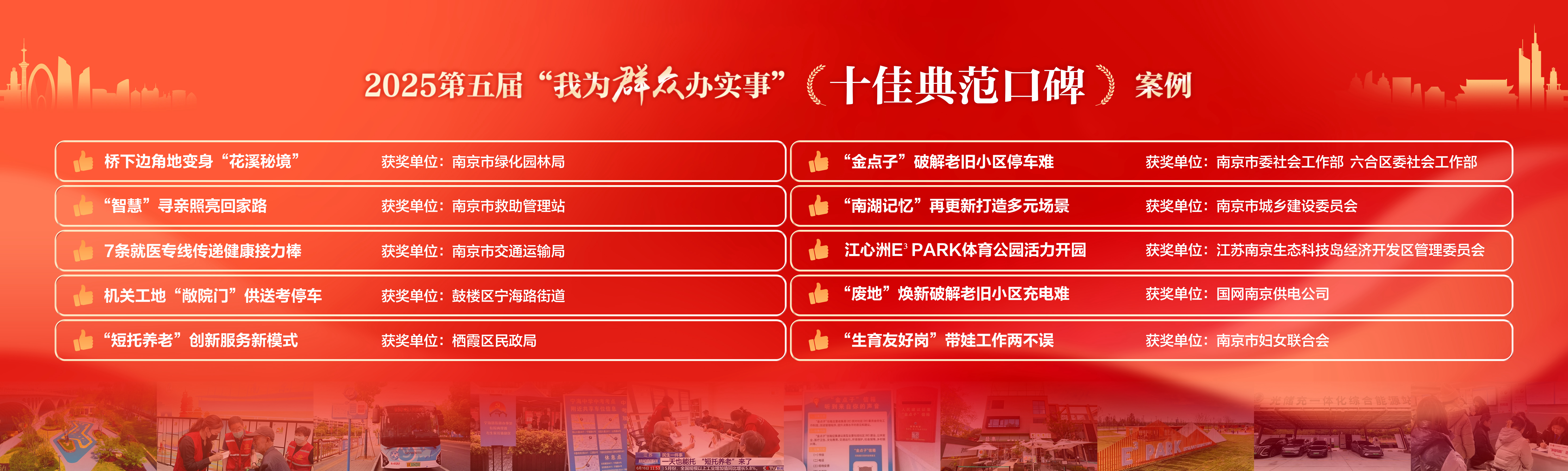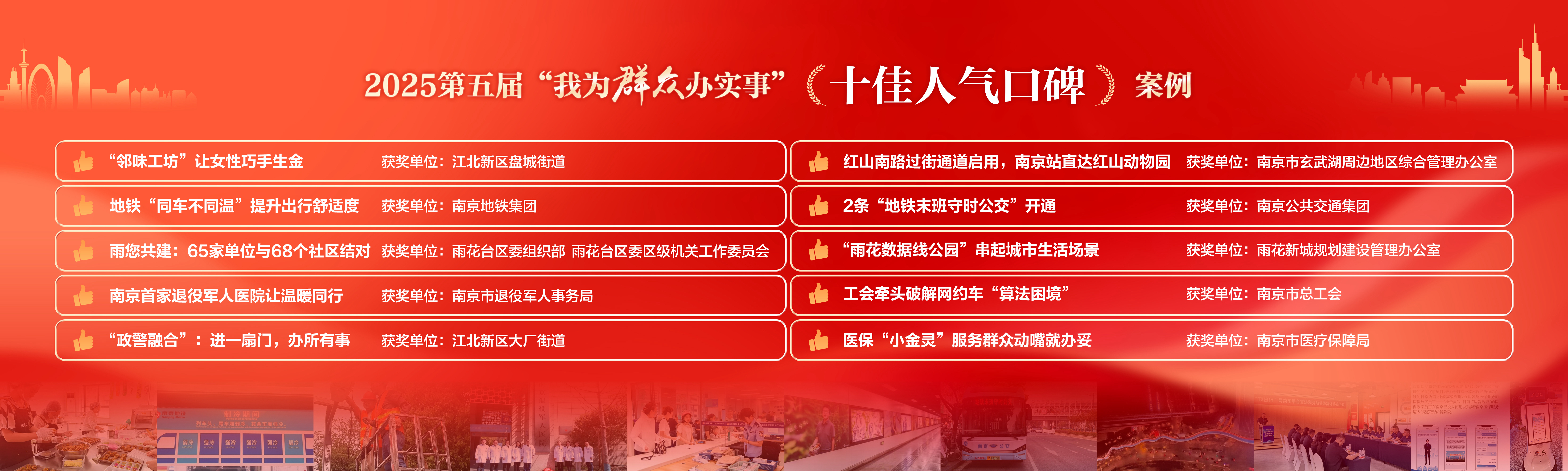 第五届“我为群众办实事”群众口碑案例征集活动征集出年度百佳案例,现场发布了年度十佳人气案例、十佳创新案例和十佳典范案例。这30个优秀案例涵盖了公共交通、助老服务、基层治理等方方面面,充分显示出了南京在民生领域的创新实践与显著成效。