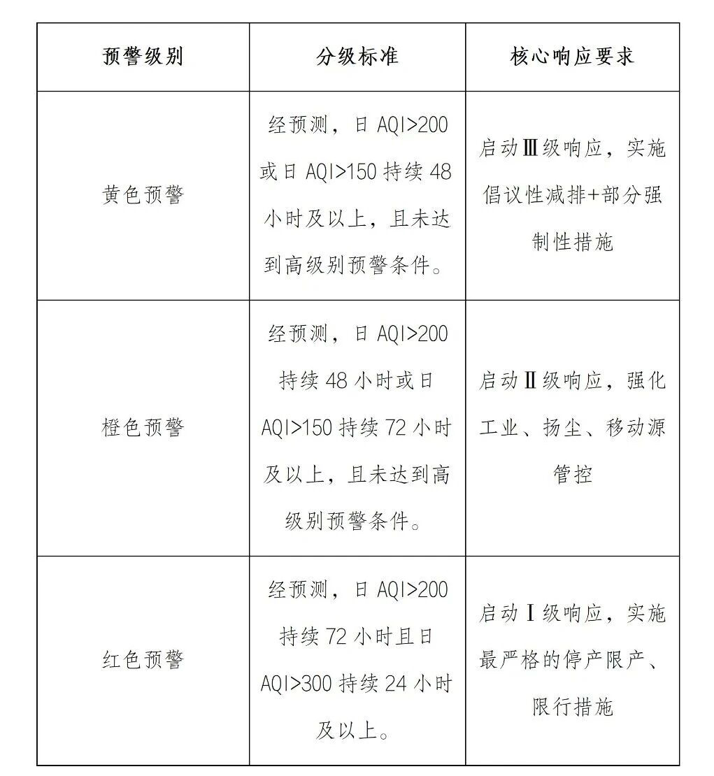 生态环境部门执法人员表示:重污染天气统一采用空气质量指数(AQI)为分级指标,日AQI按连续24小时(跨自然日)计算。按照污染程度和持续时间,预警划分为3个等级,由轻到重依次为黄色预警、橙色预警、红色预警,具体标准见图: