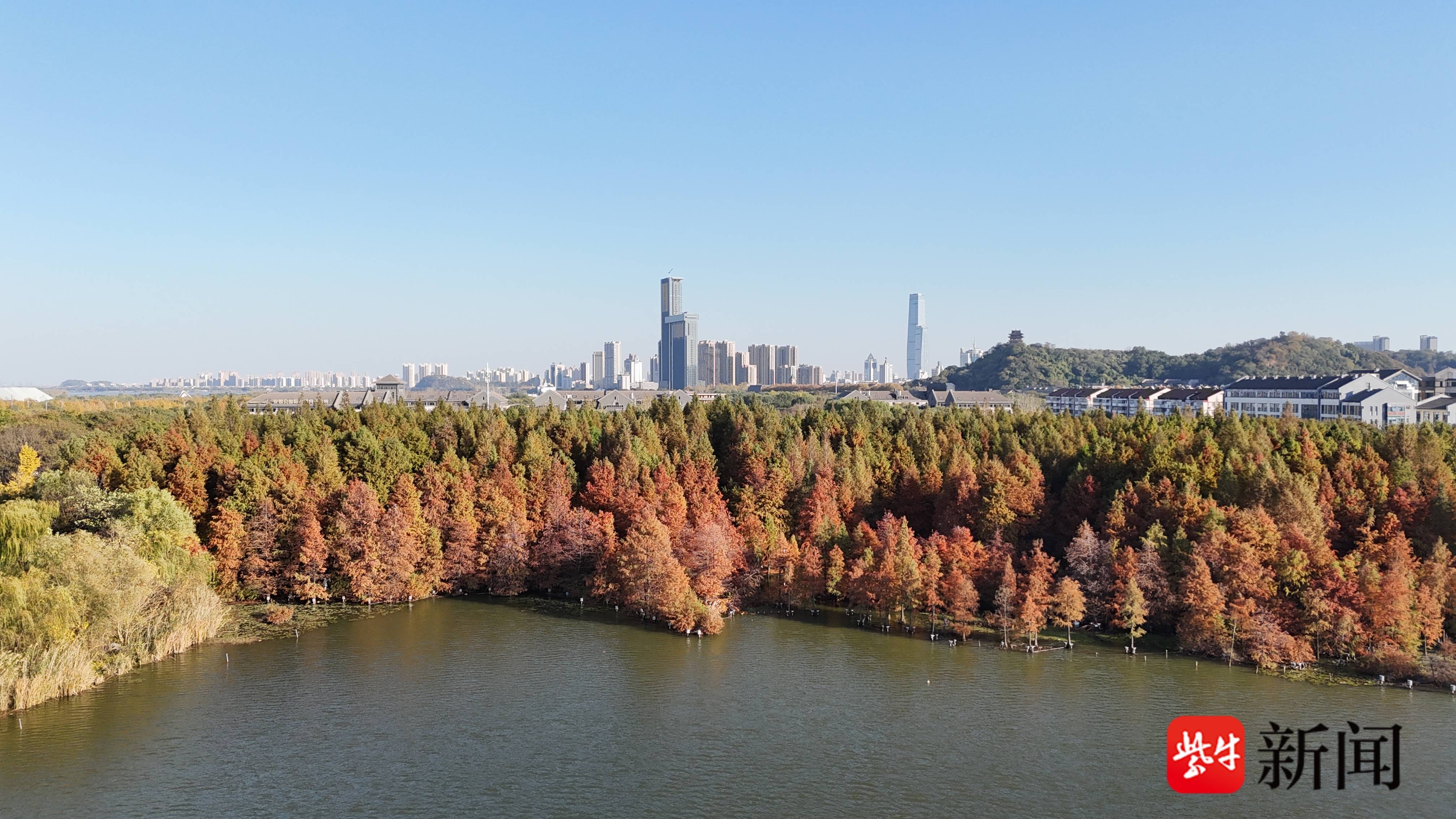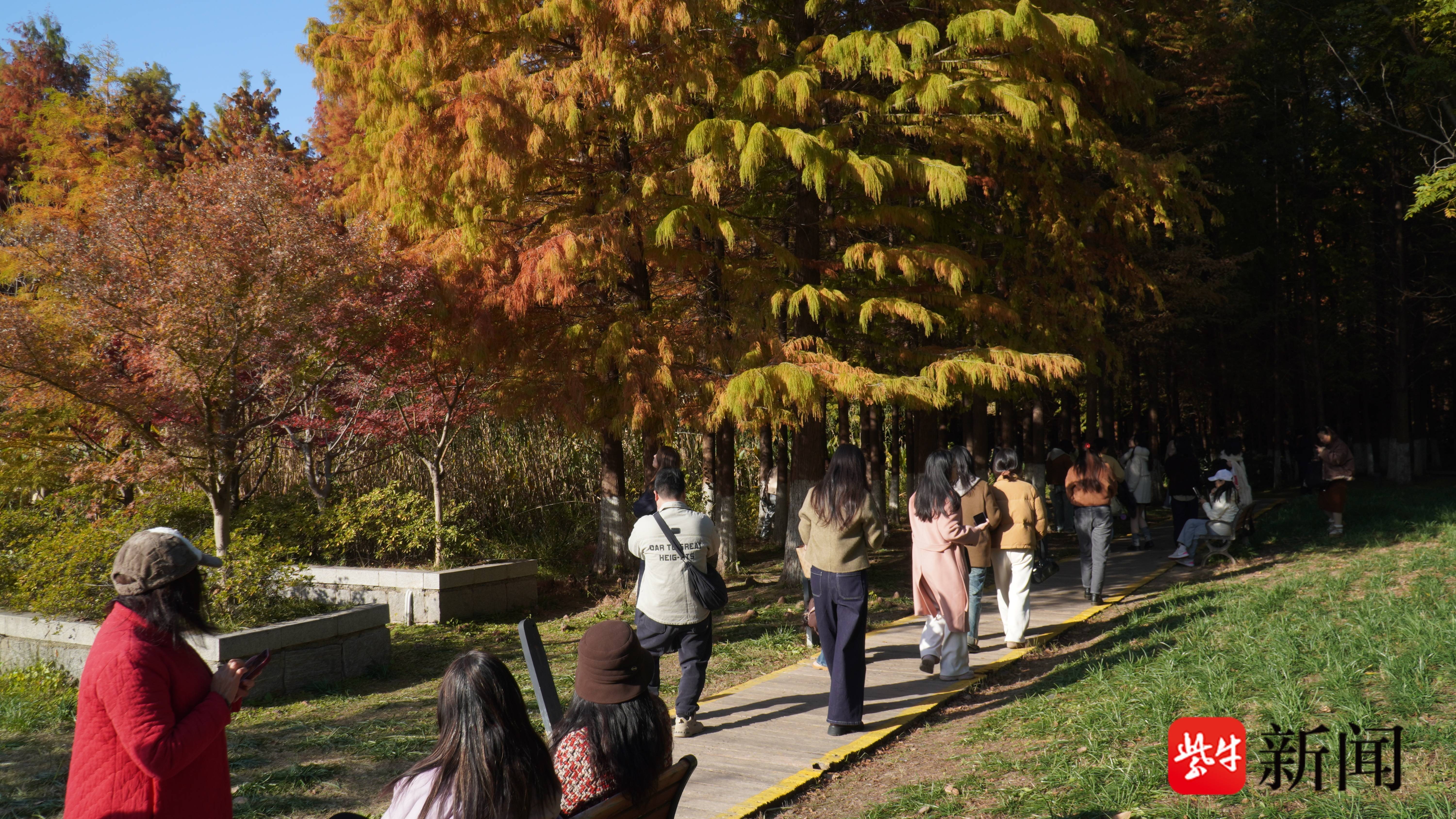 扬子晚报网11月26日讯(通讯员 纪安璐 记者 姜天圣)初冬的金山湖景区,成片水杉褪去翠绿、渐染绯红,枝干倒映在澄澈水面,吸引了大量市民前来打卡游玩。