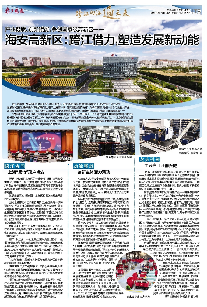 一座产业园就是一条产业链。驱车行驶在海安高新区,时尚锦纶产业园、电子信息产业园等专业园区,链上企业相互配套、协同分工,形成有序发展、抱团共赢的良好局面。目前,时尚锦纶产业园已落户锦纶企业56家,锦纶丝产量占全国八分之一,正推动产业迈向千亿级;电子信息产业园构建智慧信息、电子加工、半导体制造等功能区,着力打造长三角电子信息产业特色制造和创新基地。