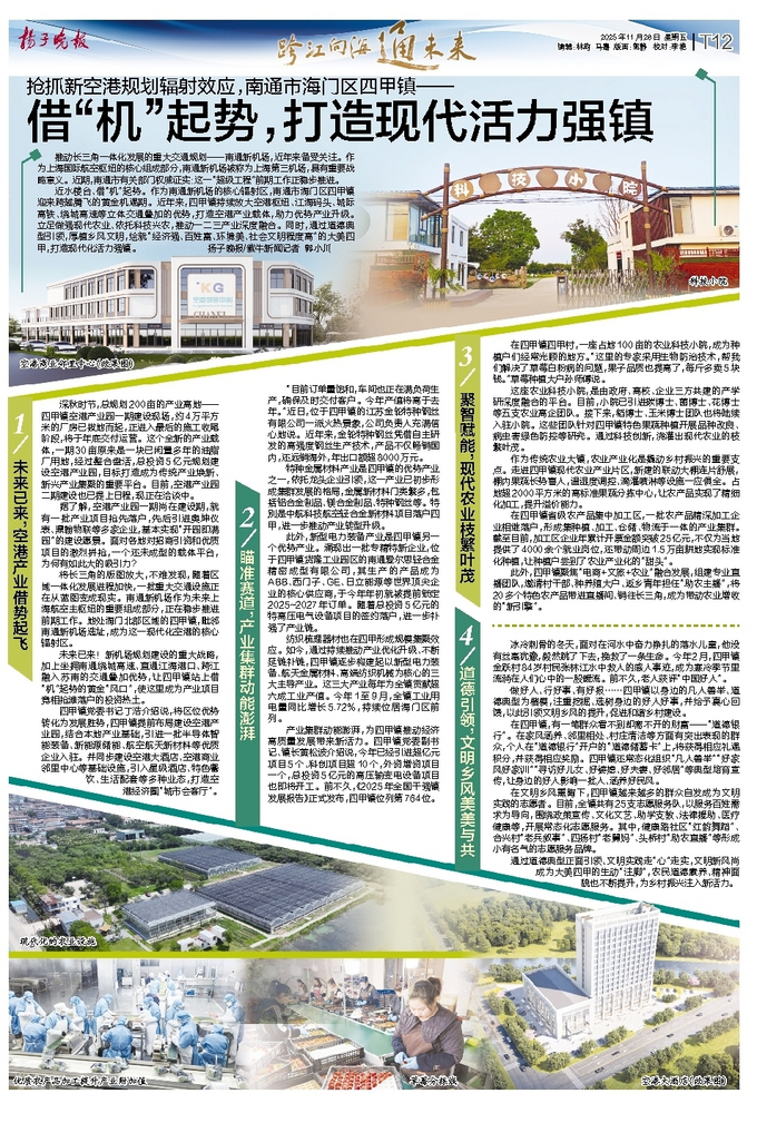 近水楼台、借“机”起势。作为南通新机场的核心辐射区,南通市海门区四甲镇迎来跨越腾飞的黄金机遇期。近年来,四甲镇持续放大空港枢纽、江海码头、城际高铁、绕城高速等立体交通叠加的优势,打造空港产业载体,助力优势产业升级。立足做强现代农业、依托科技兴农,推动一二三产业深度融合。同时,通过道德典型引领,厚植乡风文明,绘就“经济强、百姓富、环境美、社会文明程度高”的大美四甲,打造现代化活力强镇。