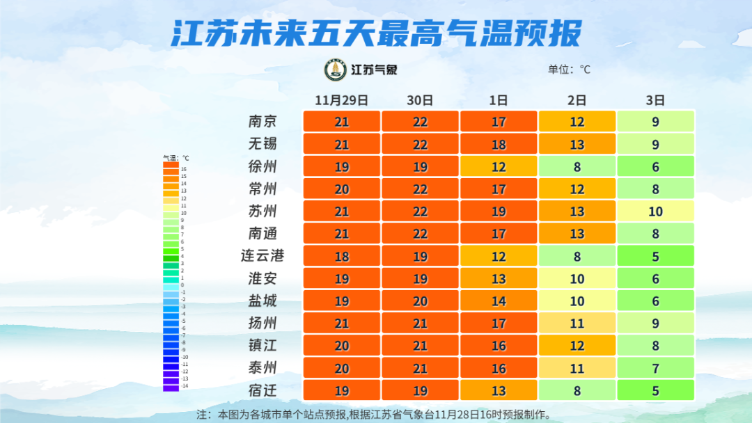 全省晴到多云。最高温度:淮北地区17~18℃,苏南地区21℃左右,其他地区19~20℃;最低温度:沿淮和淮北地区3℃左右,其他地区5~6℃。全省偏南风转偏北风,风力都是4级左右。