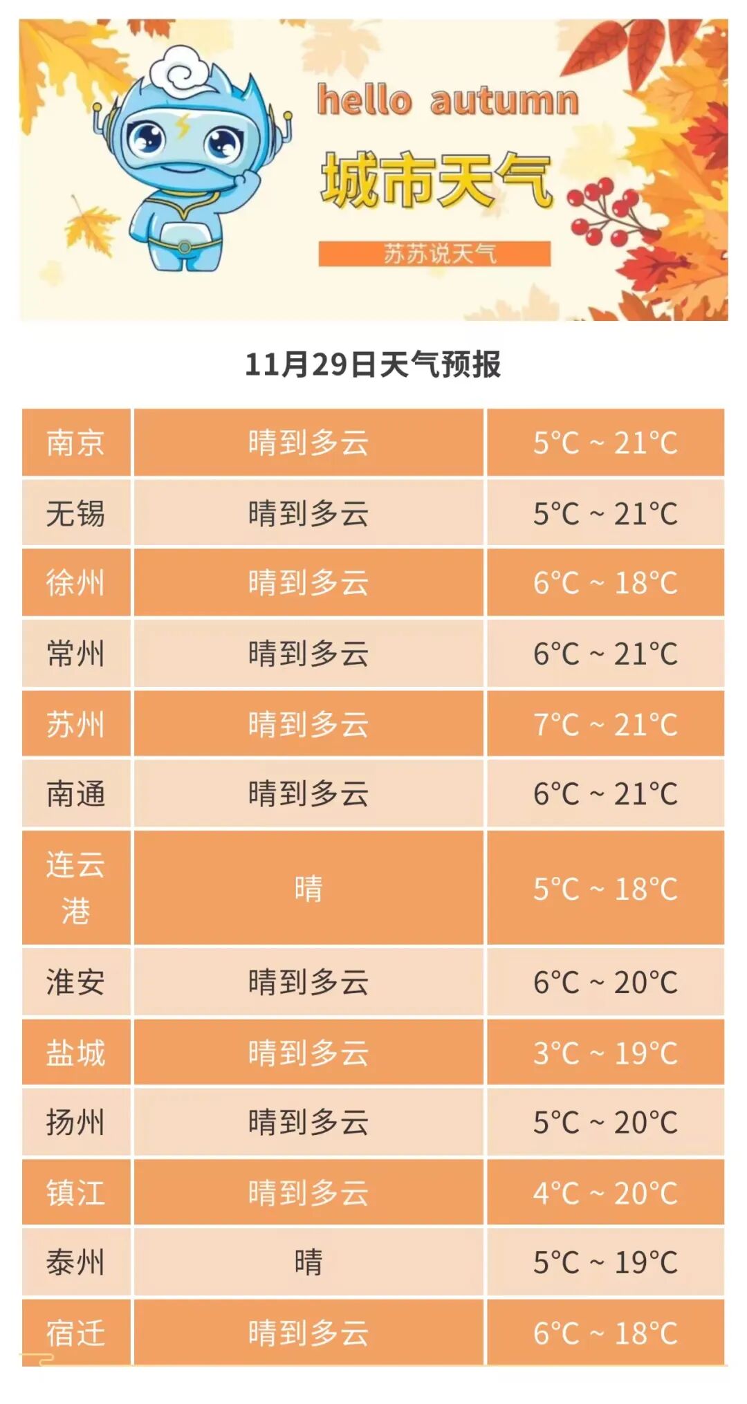 全省晴到多云。最高温度:淮北地区10~11℃,苏南地区17℃左右,其他地区13~14℃;最低温度:淮北北部地区2℃左右,本省东南部地区8℃左右,其他地区6~7℃。全省偏北风转偏东风,风力都是4级左右。