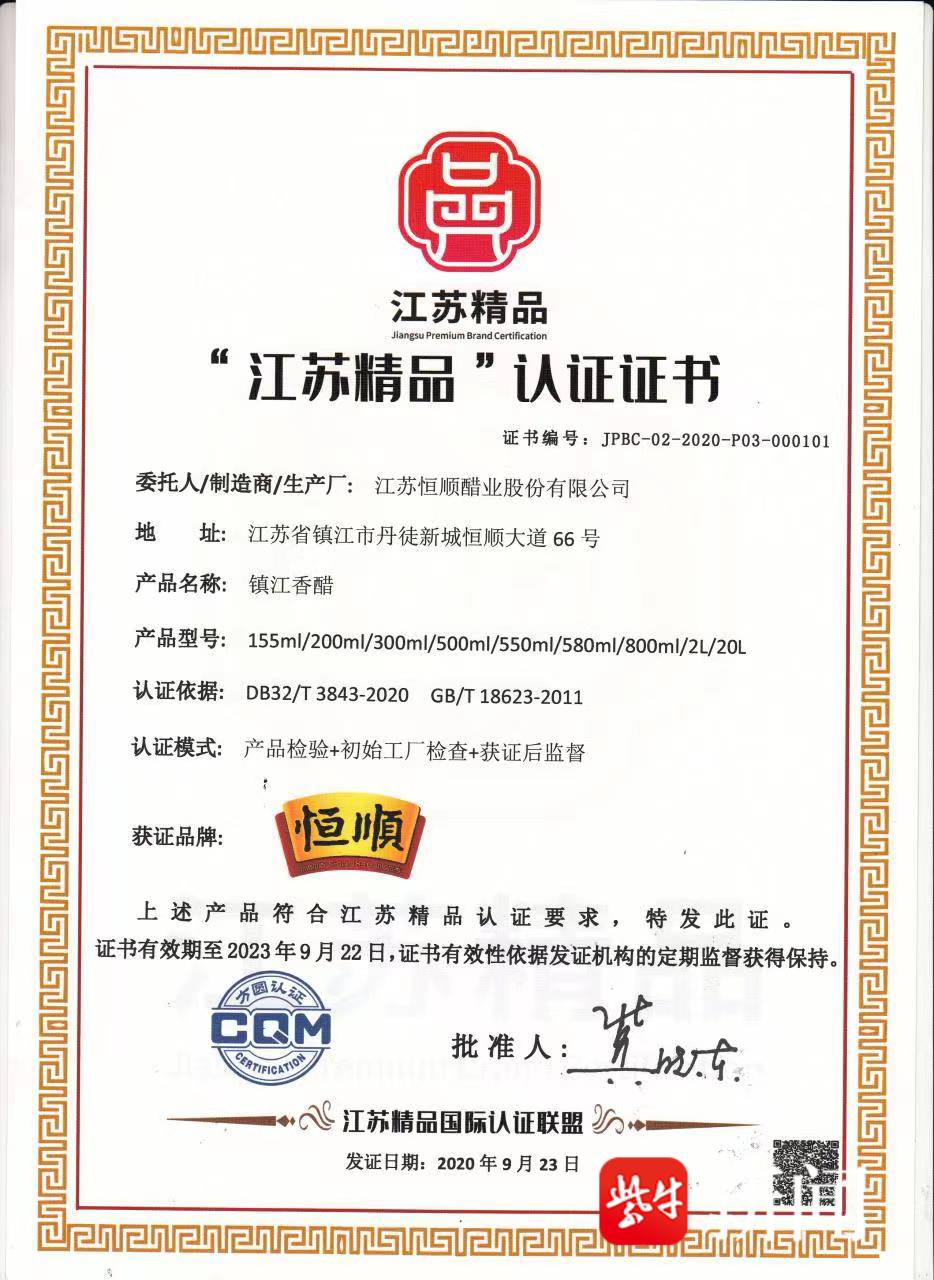 自1840年“恒顺”品牌创立以来,一代代恒顺人坚守传统、精益求精,将镇江香醋的酿造技艺不断发扬光大。其独创的“食醋固态分层发酵技艺”,被列入首批国家级非物质文化遗产保护名录。恒顺食醋产品先后5次获国际金奖、3次蝉联国家质量金奖,是欧盟地理标志互认互保产品,并于2014年获市长质量奖,2015年获省长质量奖。