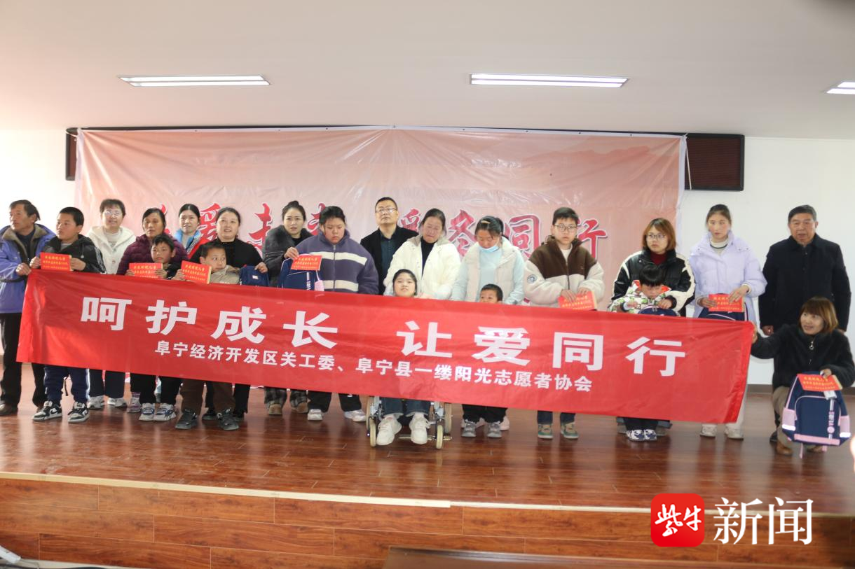 活动现场特别设置了暖冬慰问环节。经过前期细致走访与筛选,十名来自肢体残疾、单亲等困境家庭的儿童代表受邀到场。在众人关切的目光中,阜宁县一缕阳光志愿者协会及开发区代表为孩子们发放了装有崭新书包的学习用品和慰问金。这份冬日里的礼物不仅提供了物质支持,更传递了社会的温暖关怀,让每个孩子都感受到他们并不孤单。