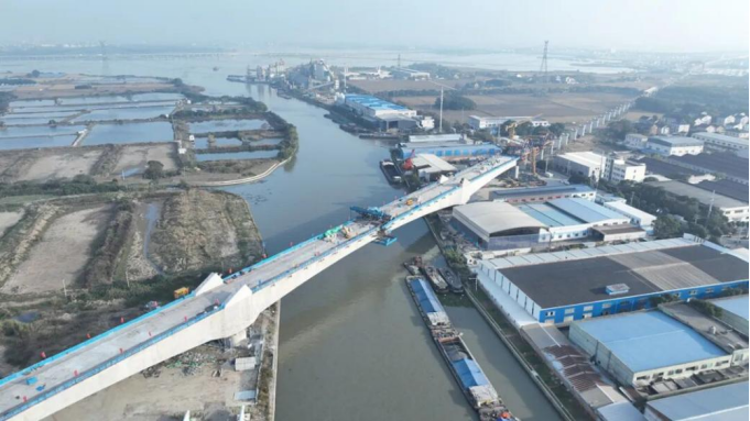 11月23日,通苏嘉甬高铁苏南特大桥跨白蚬江连续梁拱组合桥主跨顺利合龙。