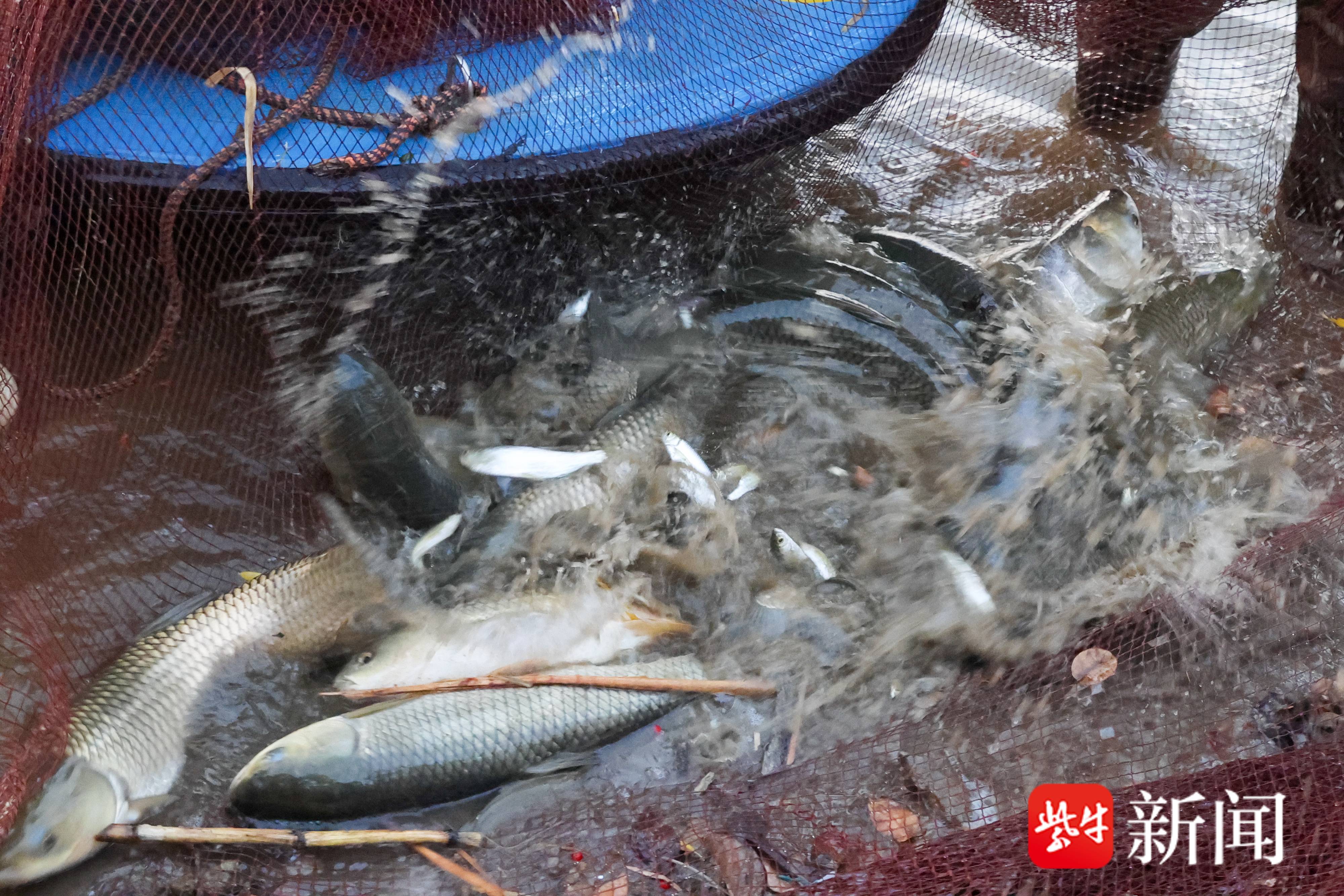 下午,随着指挥哨声响起,湖面泛起层层银浪,偶有鱼儿跃出水面。随着鞭炮声,渔工们齐心协力拉起巨网,瞬间形成“鱼跃龙门”的景象,鱼儿“跳跃”,现场一派热闹喜庆,引得围观游客阵阵惊叹。