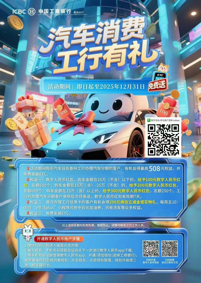 活动期间在泰州工行办理汽车分期的客户,有机会得最高508元权益,并免费安装ETC,另有其他实惠权益,详情可联系当地支行客户经理。