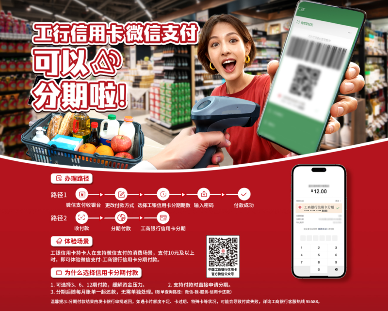 即日起泰州工行信用卡持卡人在支持微信支付的消费场景,支付10元及以上时,即可体验“微信支付——工商银行信用卡分期付款”,可选择3、6、12期付款,缓解资金压力。