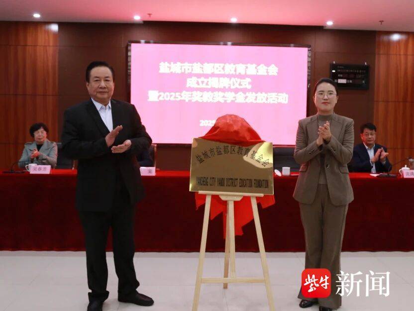 在全体与会人员的热烈掌声中,陈晶晶副区长与徐守清董事长共同为“盐城市盐都区教育基金会”揭牌,标志着这一汇聚社会爱心、助推教育发展的全新平台正式启航。