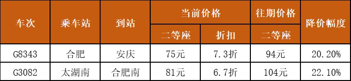 京港高铁合九段动车组列车本期降价达44趟次,达到线路总列数的近60%,其中超过三分之一的降价车次降价幅度超过两成,23趟列车实行7折及以下优惠,最低低至4折。以G8343次与G3082次为例,合肥至安庆,太湖南至合肥南降价约两成。