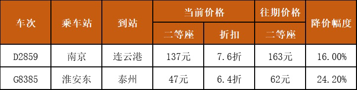连镇高铁动车组列车本期降价56趟次,约占线路总列数四成,最高降幅近4成,20趟列车实行7折及以下优惠。以D2859次及G8385次为例,南京至连云港,淮安东至泰州降价约两成。