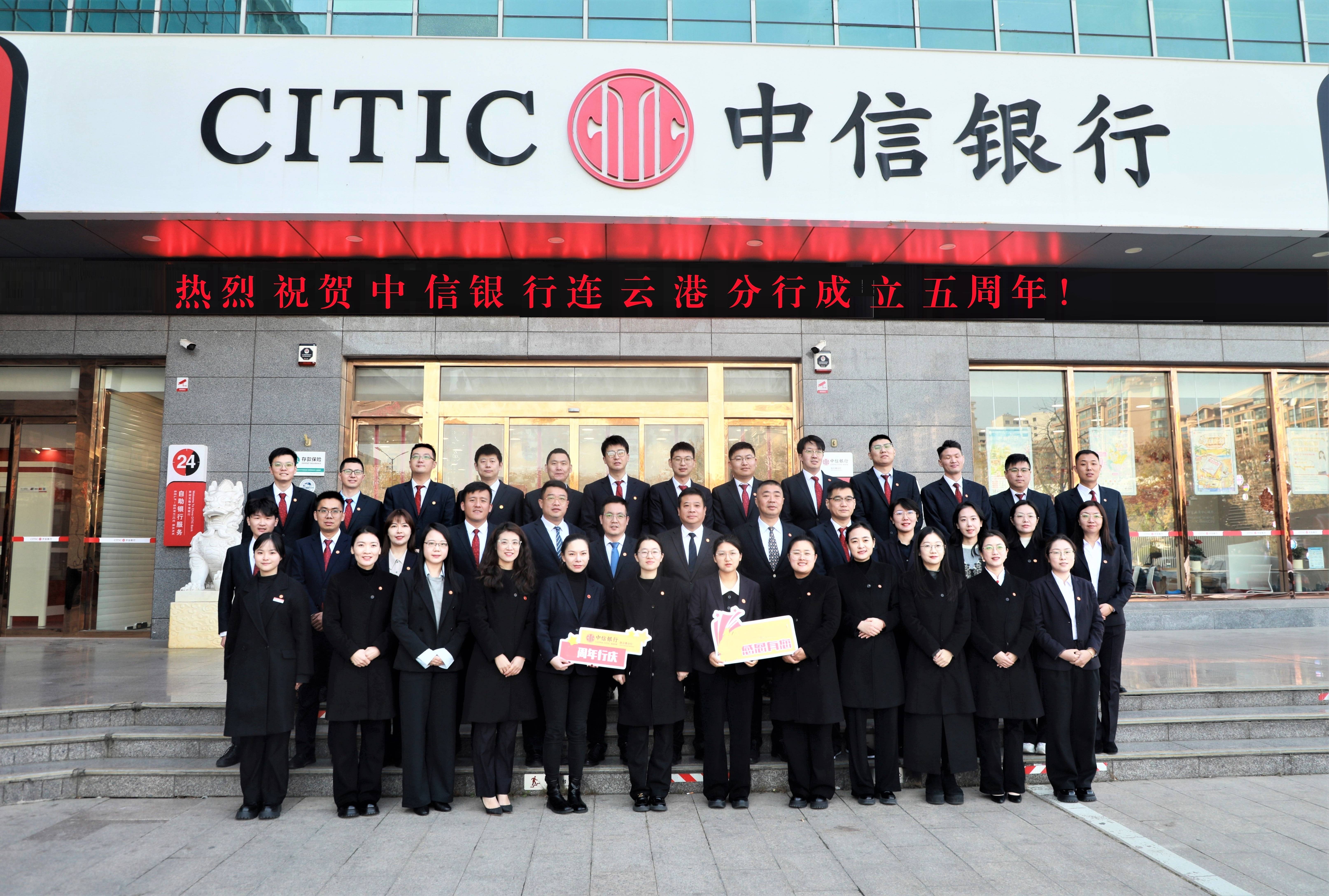 2020年12月9日,乘着“一带一路”倡议的浩荡东风,中信银行股份有限公司连云港分行在黄海之滨江苏连云港正式揭牌开业。五年来,作为连云港“高质发展、后发先至”进程中的重要金融力量,中信银行连云港分行秉持“有担当、有价值、有特色、有温度”发展愿景,与“一带一路”战略支点城市并肩前行,以党建为引领、以实体为根本、以转型为动力,以协同为优势,在港城大地上奏响了一曲金融赋能实体经济、服务人民美好生活的昂扬乐章,在奋楫扬帆中绘就了一幅从无到有、由小到强的发展长卷。