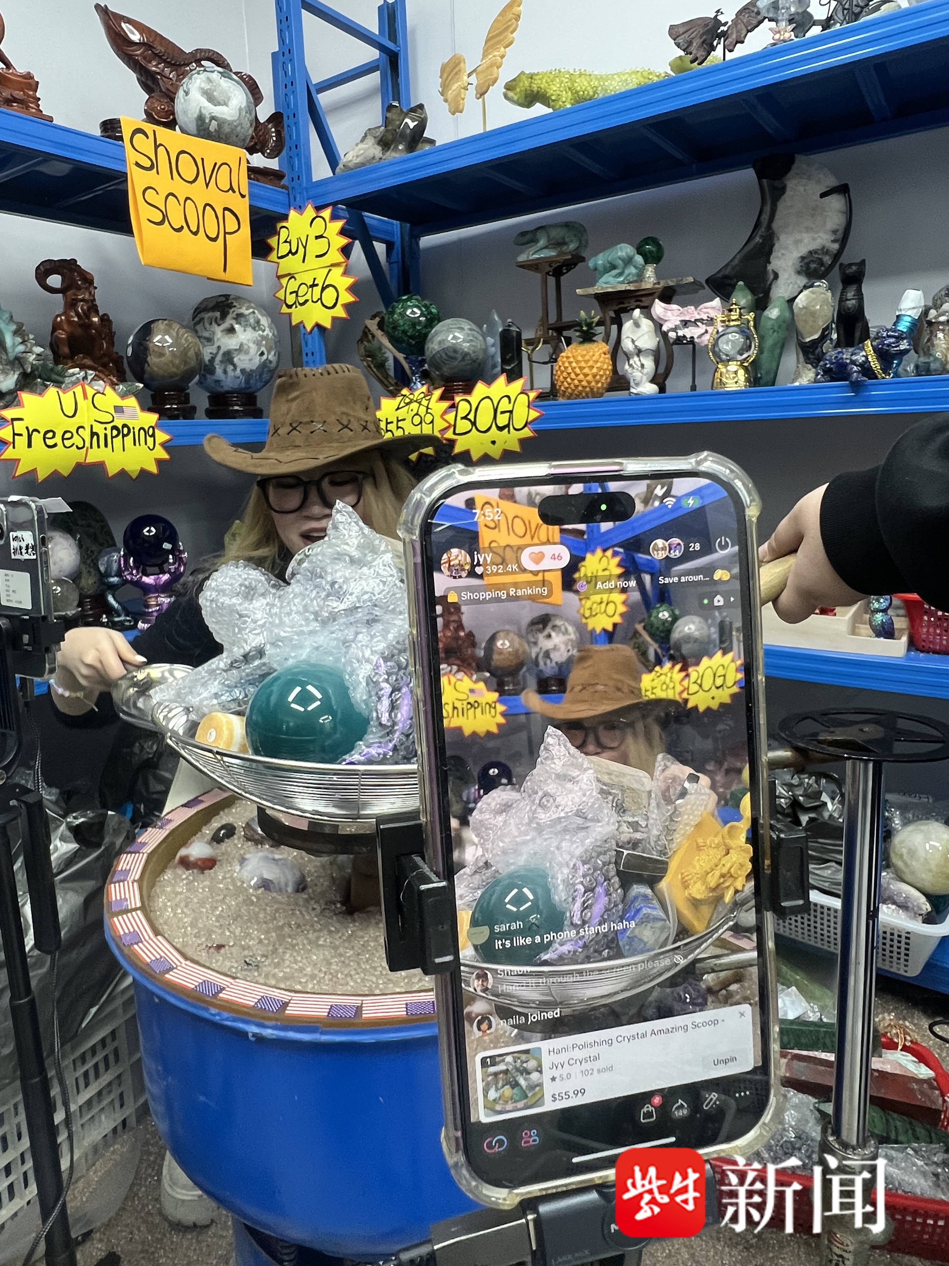 东海抖音电商基地工作人员在网络上推介和销售水晶产品。 薄云峰 摄