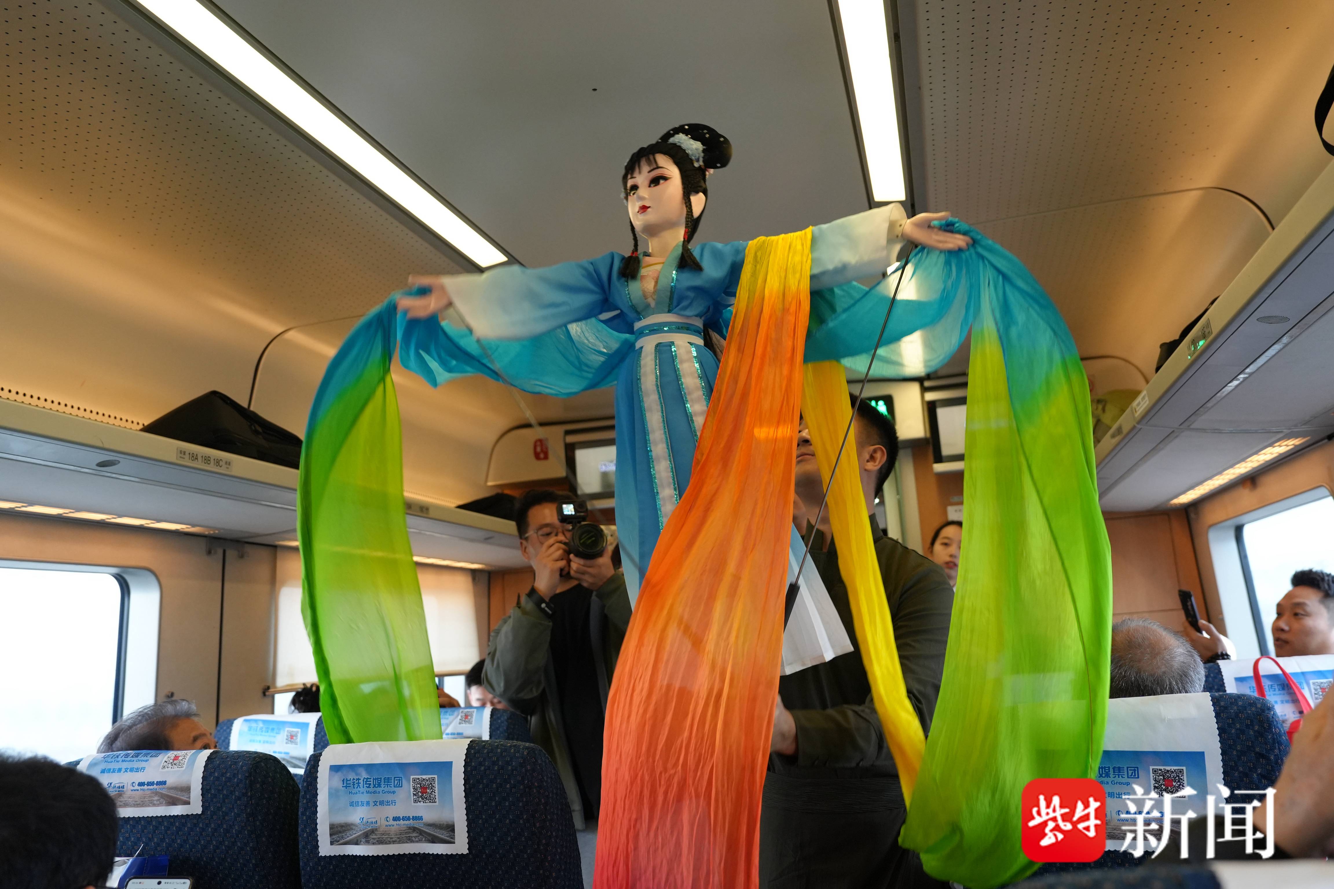 列车飞驰,车厢变身文化展厅。悠扬的小提琴声中,泰州非遗 “杖头木偶” 翩然起舞,表演者双手灵活操纵,木偶在方寸之间展现百态。南京客运段的乘务人员精心准备了歌舞、朗诵、礼仪展示等节目,让旅途成为流动的文化盛宴。