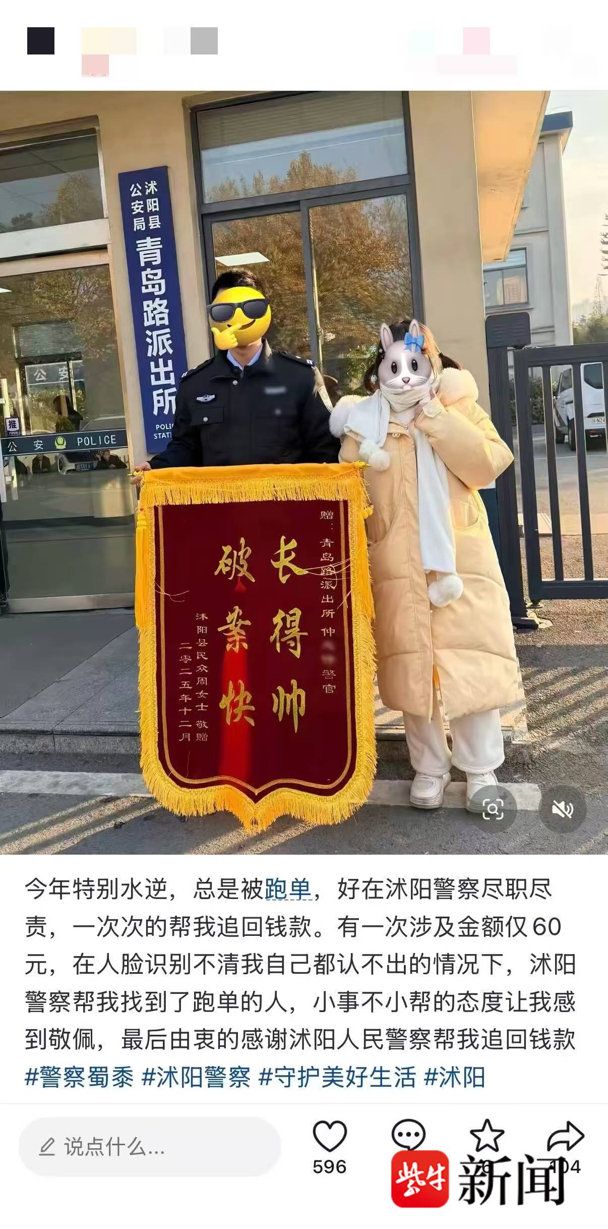 为表达感激之情,店主特意定制了这面“接地气”的锦旗送到派出所,并将自己的经历分享至网络平台。她感慨道:“警察同志连这种小事都认真对待,让我特别感动!”