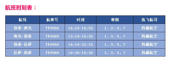记者了解到,具体航班班期为,每周一、三、五、日执行,去程 (TV9990):16:10从扬泰机场起飞 → 18:55抵达南充 → 22:10抵达拉萨贡嘎机场;返程 (TV9989):10:20从拉萨起飞 → 13:10从南充起飞 → 15:30抵达扬泰机场。据介绍,此次开通的航线并非简单的点对点飞行,而是经过精心设计,串联起川藏文化长廊的精华。