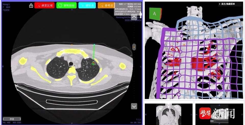 CT影像导入系统后,患者的“数字胸部器官”自动呈现在眼前,并同步显示在电脑屏幕上。通过调整视角锁定结节位置后,张主任手持定位针,循着导航提示的最优路径,巧妙避开肋骨和重要血管,精准将“伞形”标记物送达目标区域并成功释放。