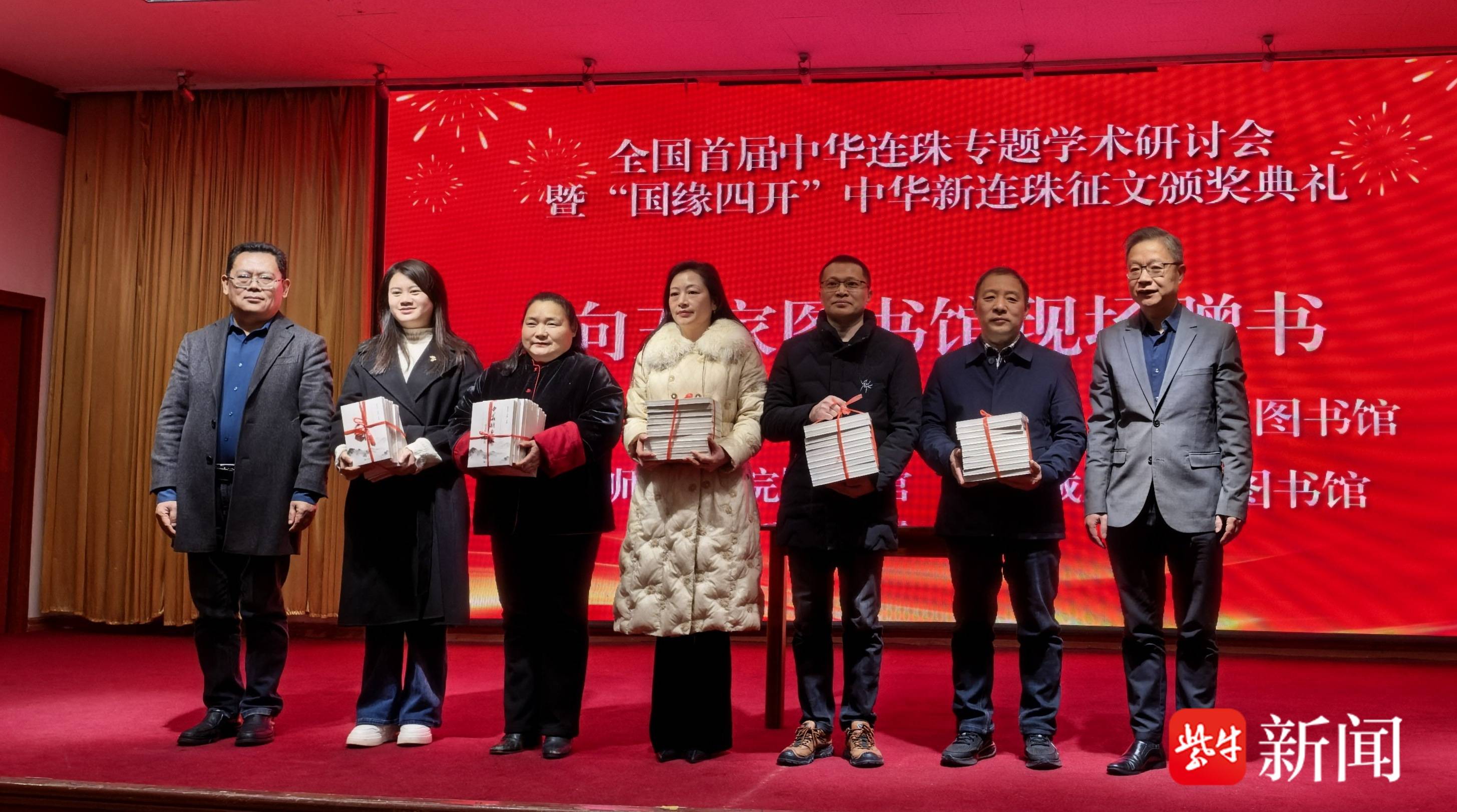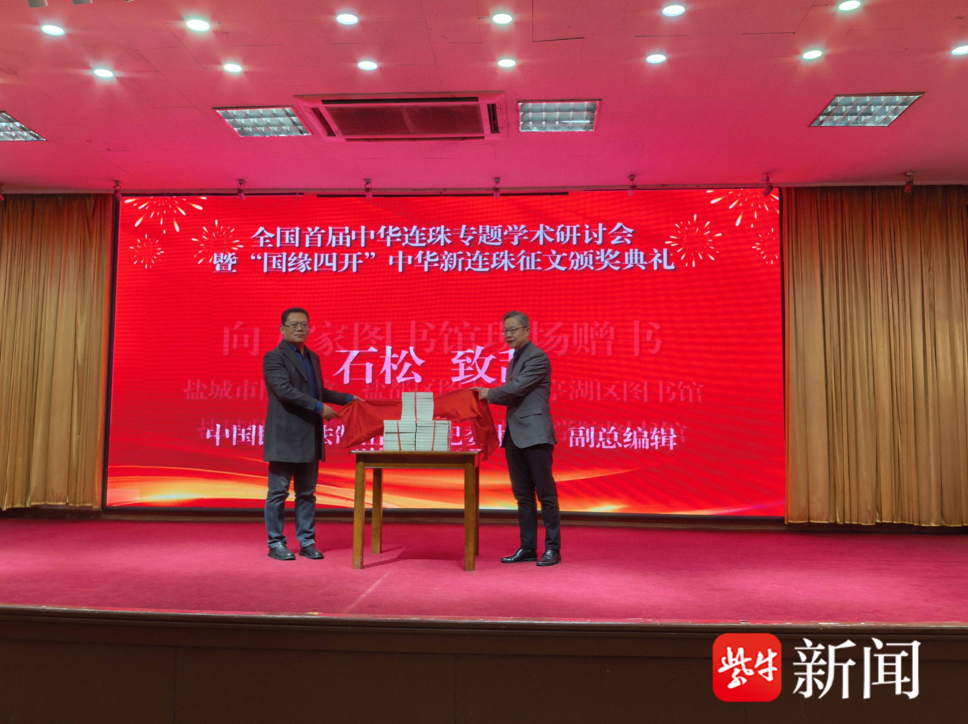 在大会颁奖典礼上,公布了中华连珠专题学术征文和中华新连珠作品征文获奖名单,与会相关领导和嘉宾为获奖代表颁发了荣誉证书。随后举行《中华新连珠征文获奖作品选》新书发布仪式,王淼和石松分别致辞,为新书揭幕,并向盐城市内五家图书馆现场赠书。
