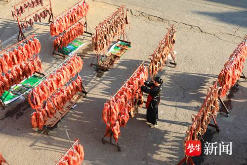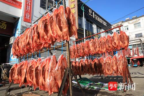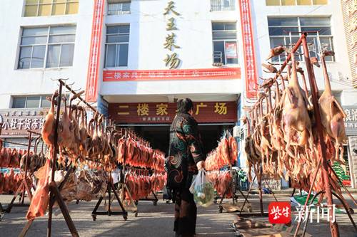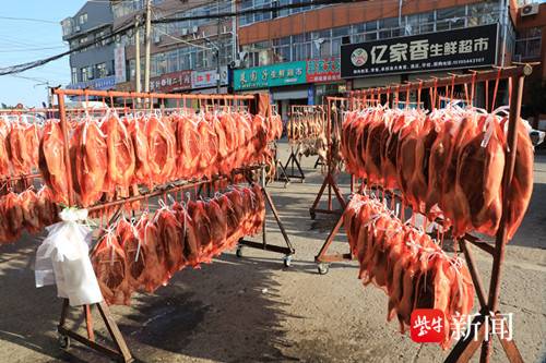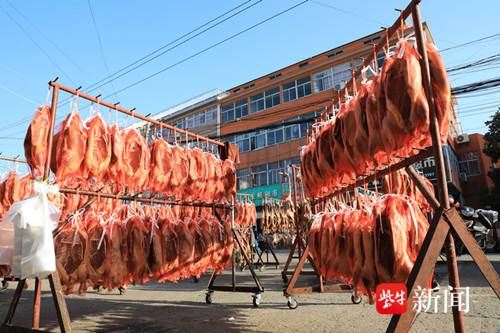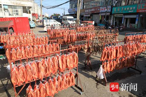 扬子晚报网12月7日讯(通讯员 徐福庚 记者 闫春旭)“小雪腌菜,大雪腌肉。”每到入冬,我国很多地方都有腌制咸货、提前备年货的习惯。在镇江市句容市天王镇,街头农户和商家纷纷晾晒咸鱼、咸鸡、咸鸭、咸肉等。街头咸货飘香,咸货种类也丰富,它们悬挂晾晒架上,只要能想到的腌制品,在这里几乎都能找到。在阳光和风的作用下,咸货表面会析出盐霜,油脂逐渐渗透出来,色泽变得油亮,散发出浓郁的香气。这些咸货味道鲜美,深受人们的喜爱。